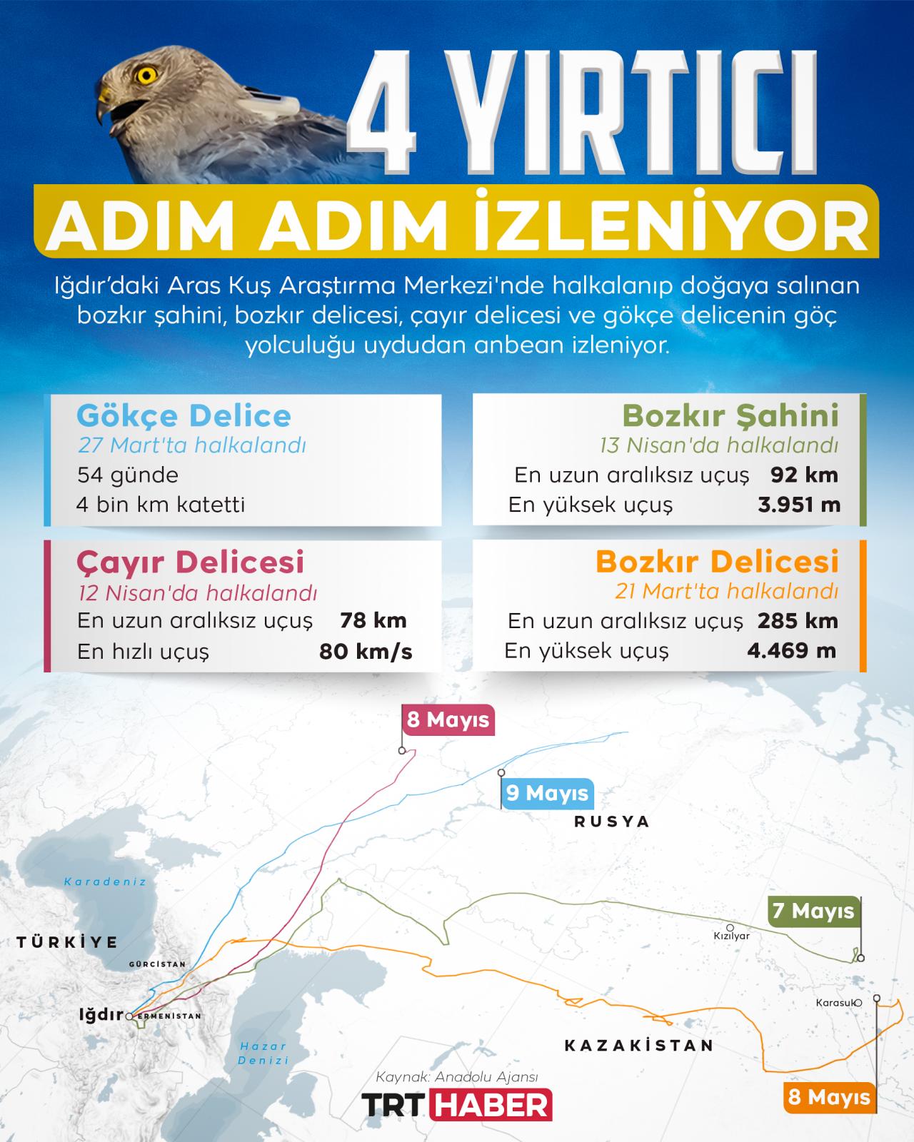 Iğdır'da bu yıl halkalanıp doğaya salınan bozkır şahini, bozkır delicesi, çayır delicesi ve gökçe delicenin göç yolculuğu uydudan anbean izleniyor.
