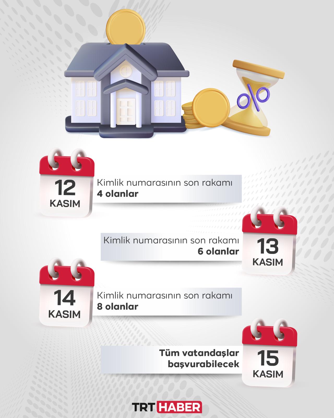 81 ilde hayata geçirilecek 500 bin konut projesine başvurular, ilk etapta TC kimlik numarasının son hanesine göre aşamalı şekilde alınacak. 15 Kasım’da bu uygulama sona erecek, 19 Aralık’a kadar tüm vatandaşlar başvuru yapabilecek.