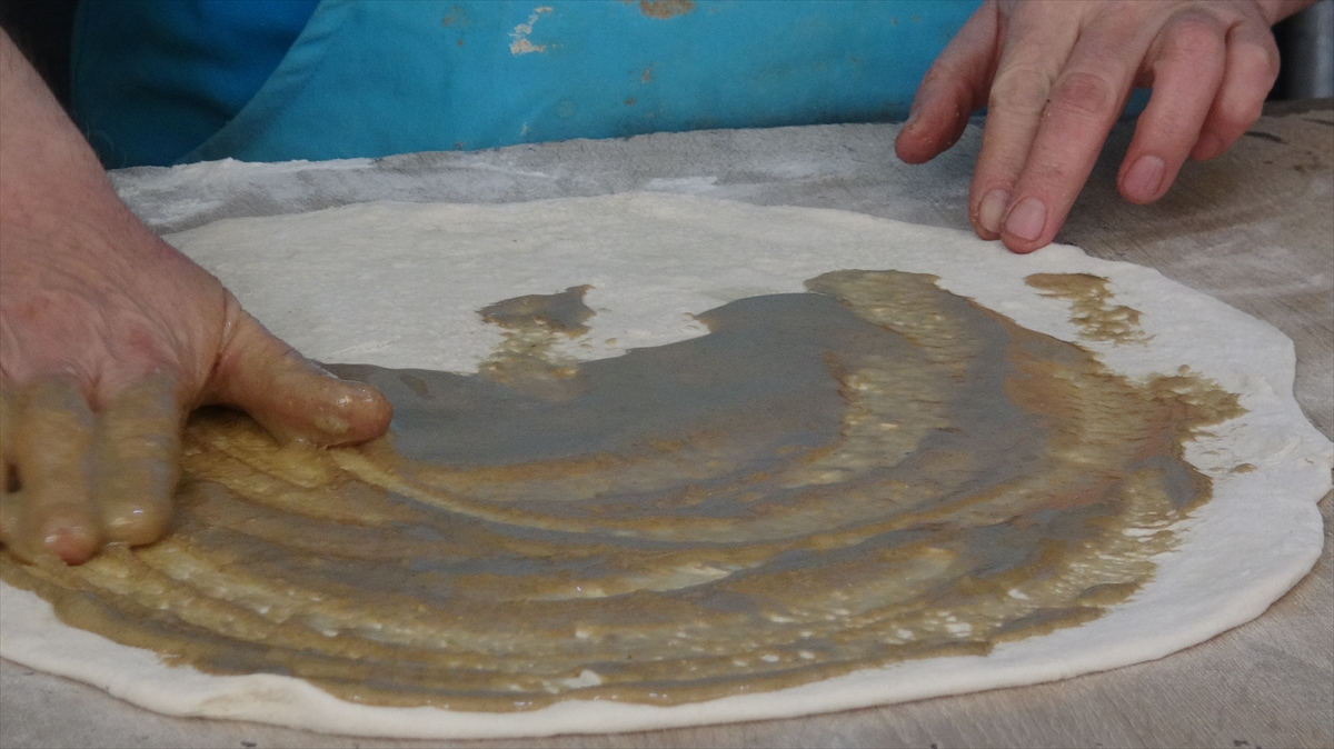 Usta ellerde ince bir şekilde açılan hamura uygulanan haşhaş ve tahin karışımı 4 kat şeklinde hazırlandıktan sonra yaklaşık 1 buçuk saat dinlenmeye bırakılıyor.