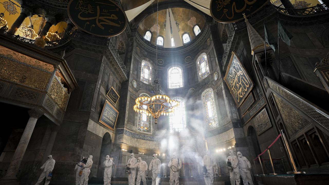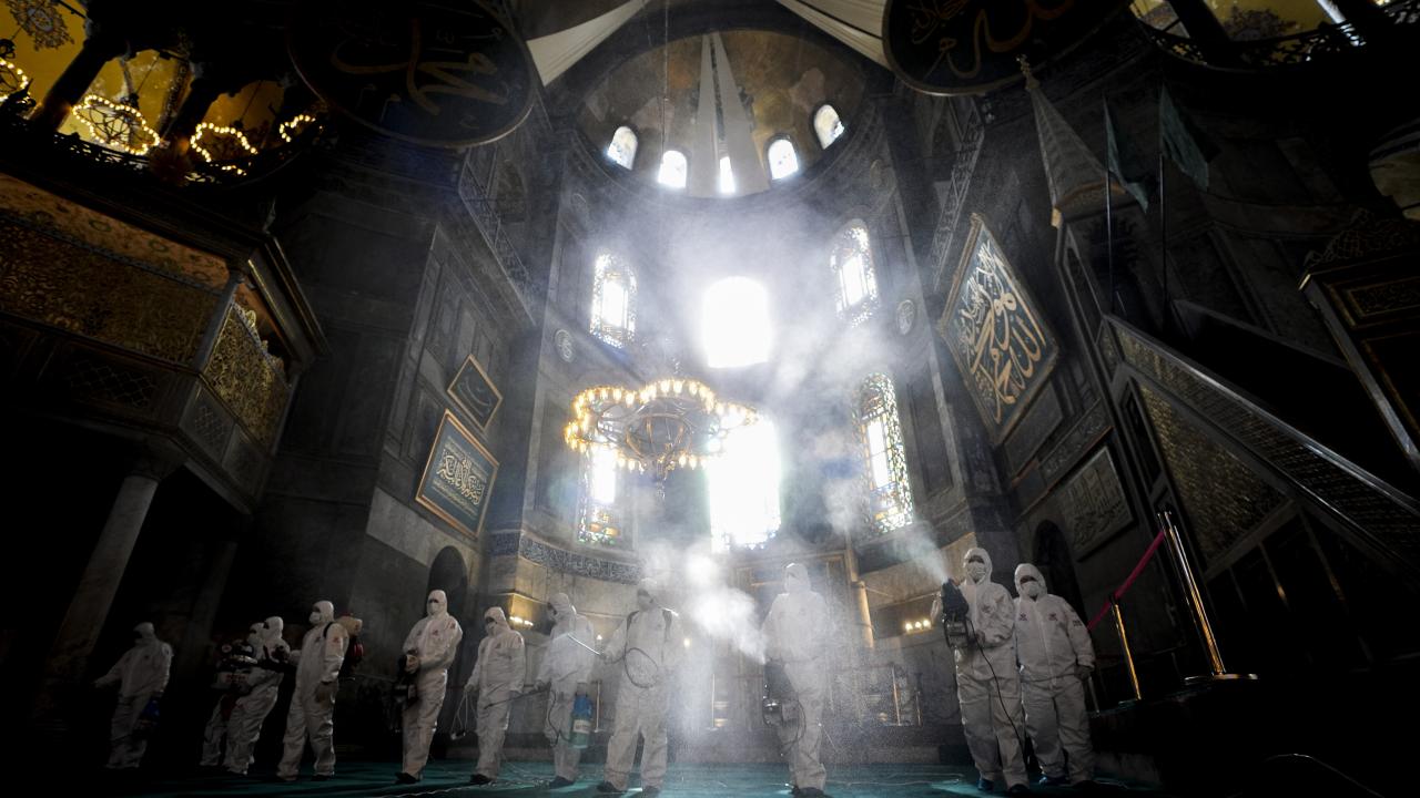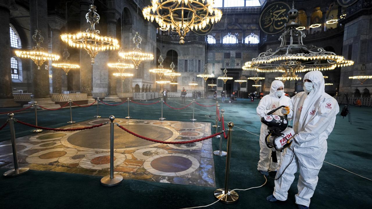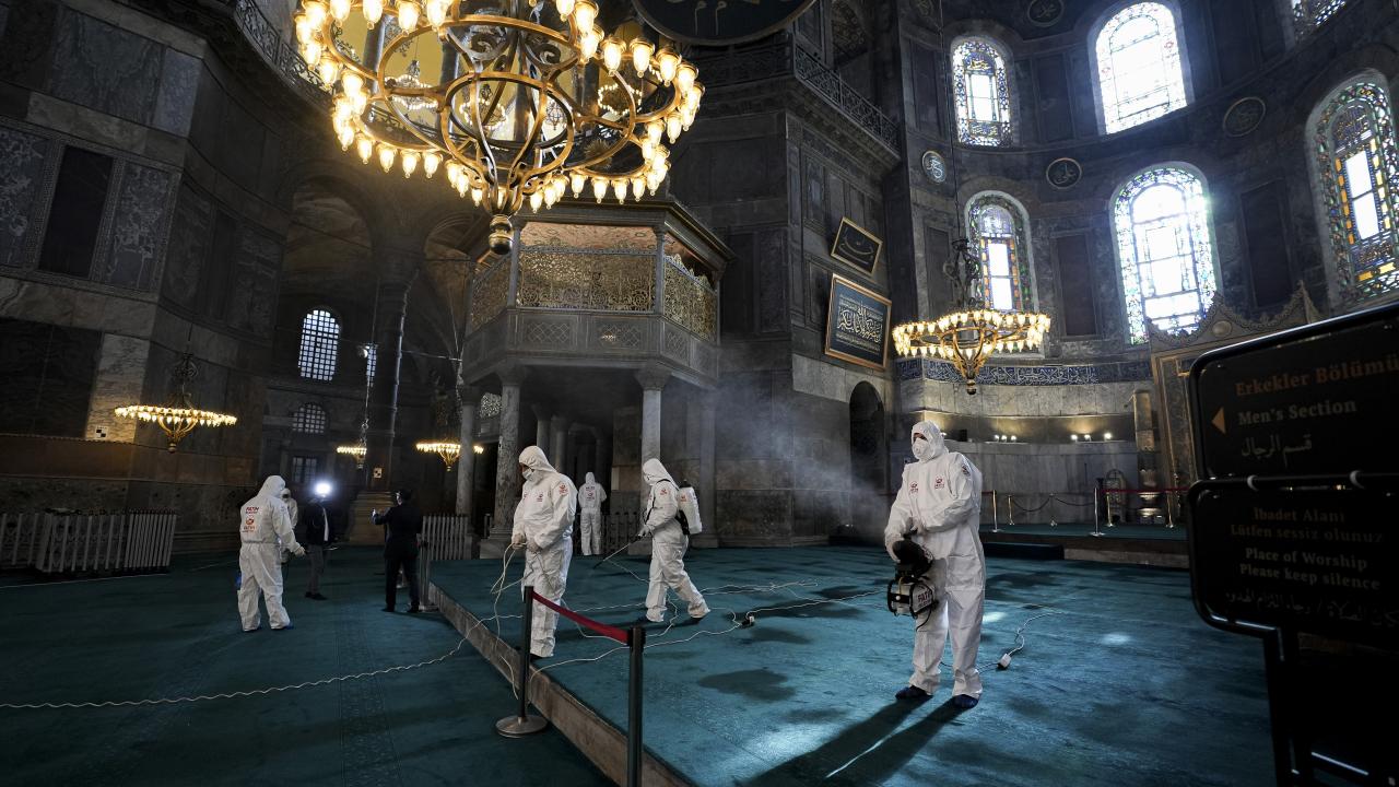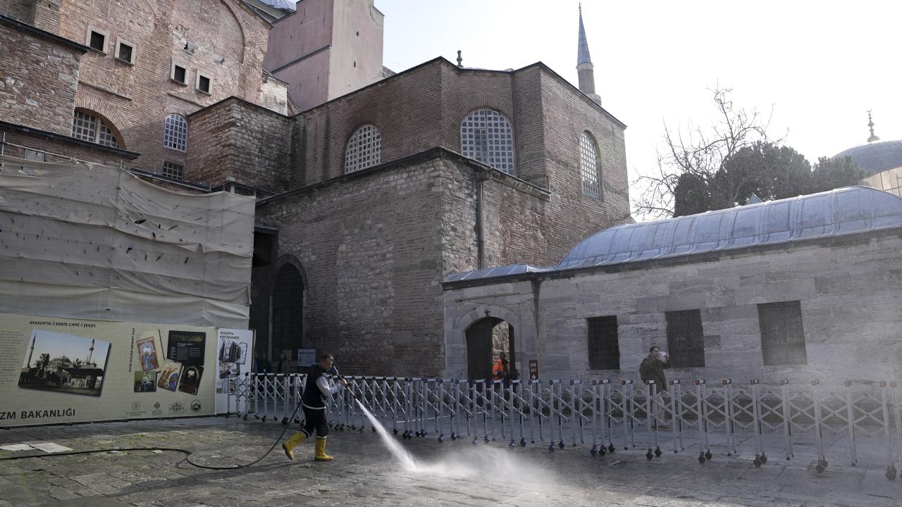 Halılar elektrik süpürgeleriyle süpürüldü, tozu alınan ayakkabılıklara ve caminin içine dezenfektan sıkıldı. Şadırvan, cami avlusu ve Ayasofya Meydanı sıcak su ve dezenfektanla yıkandı. Temizlik işlemi sonrası caminin içine ve dışına gül suyu sıkıldı.