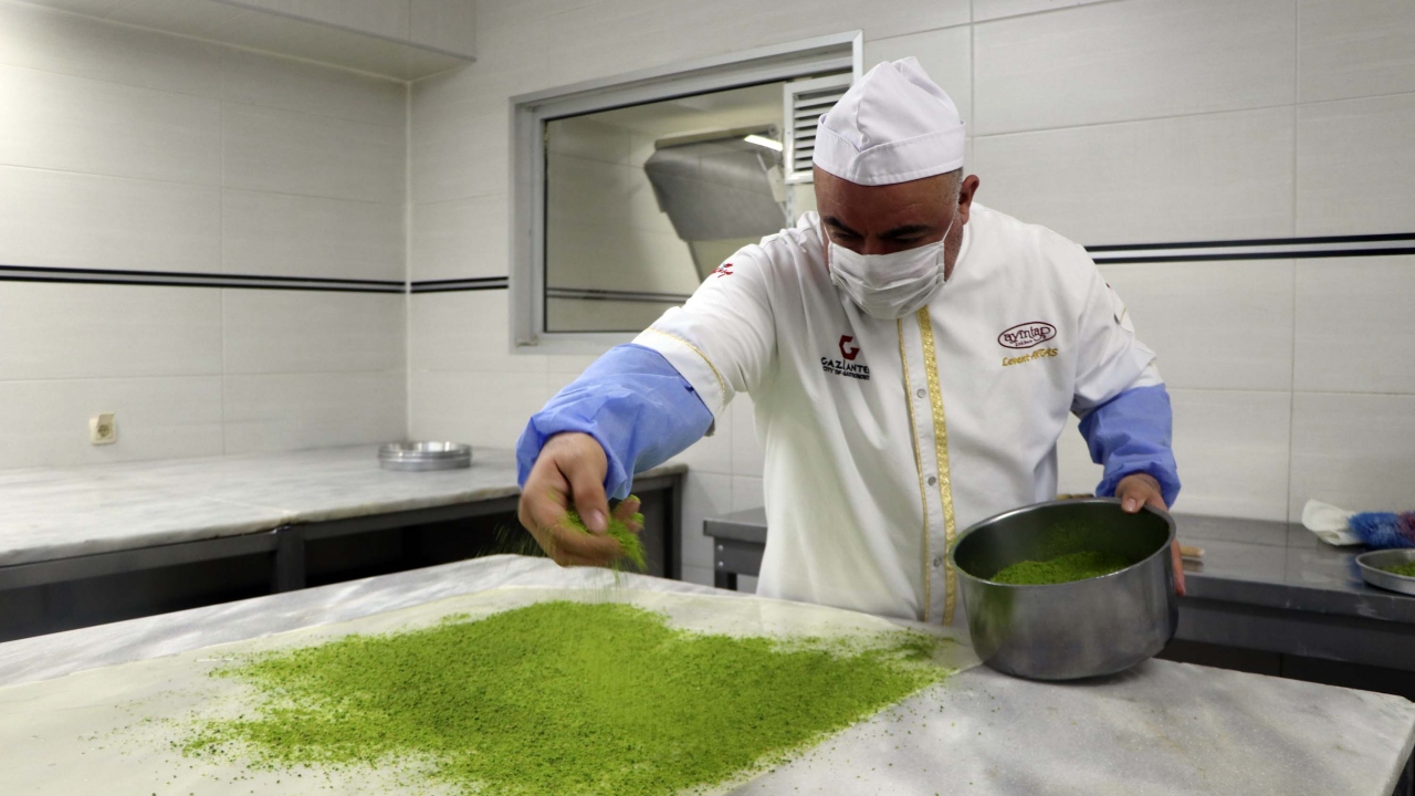 Hamuru merdaneyle adeta kağıt haline getiren ustalar, yufkayı tek tek tepsiye yerleştiriyor. Üzerine tereyağı ve fıstık dökülen baklavanın her aşamasında sosyal mesafe kuralına dikkat edilerek çalışılıyor.
