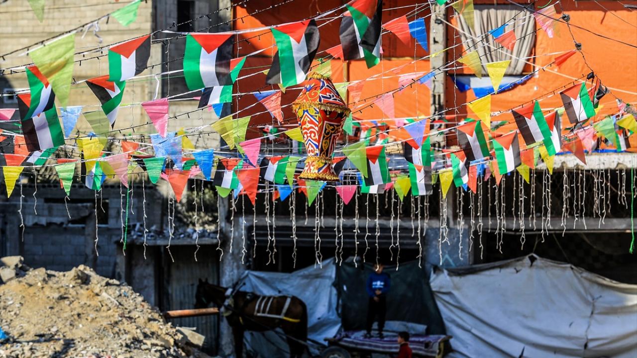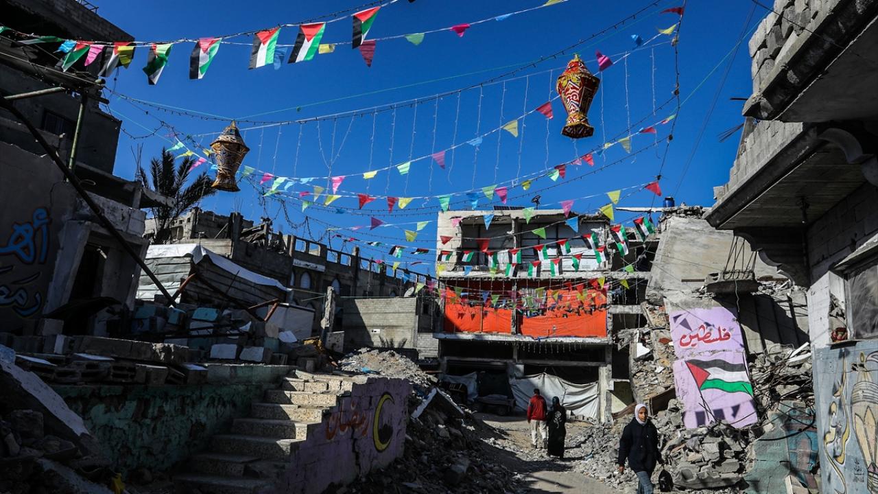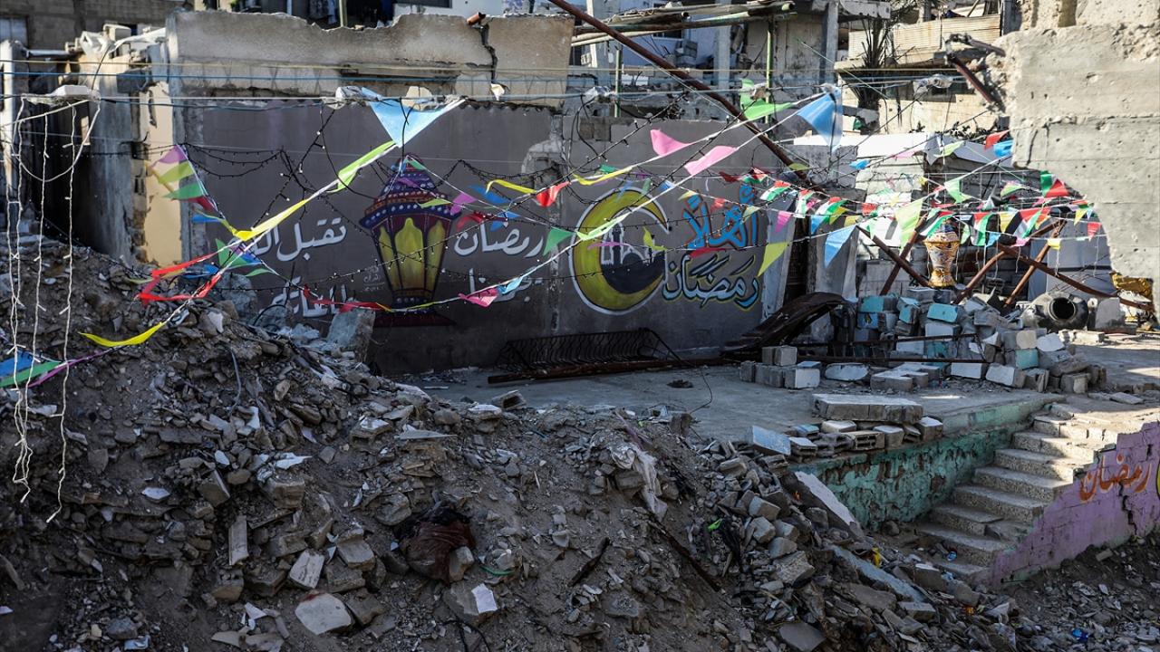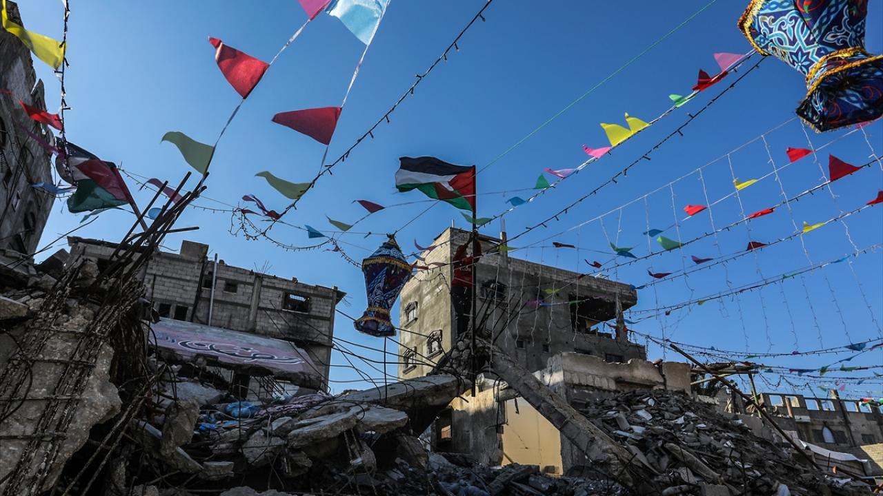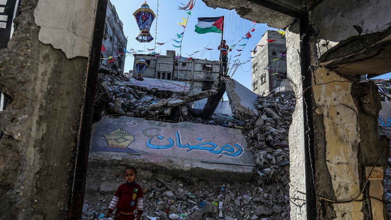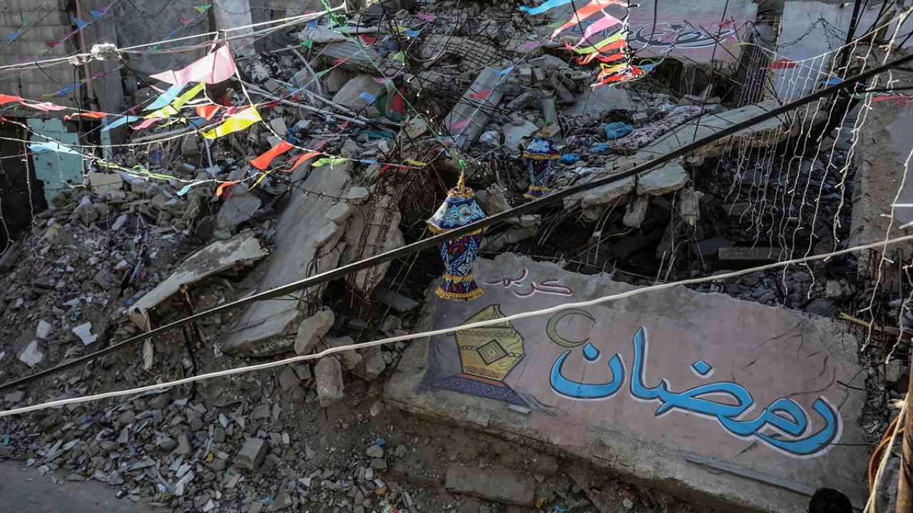 Gazze Şeridi’nin güneyindeki Han Yunus kentinde Filistinliler, İsrail ordusunun Gazze’ye yönelik son saldırılarında enkaza dönen binaların ve evlerin arasını süsleyerek Ramazan’ın manevi atmosferini yaşamaya çalışıyor.