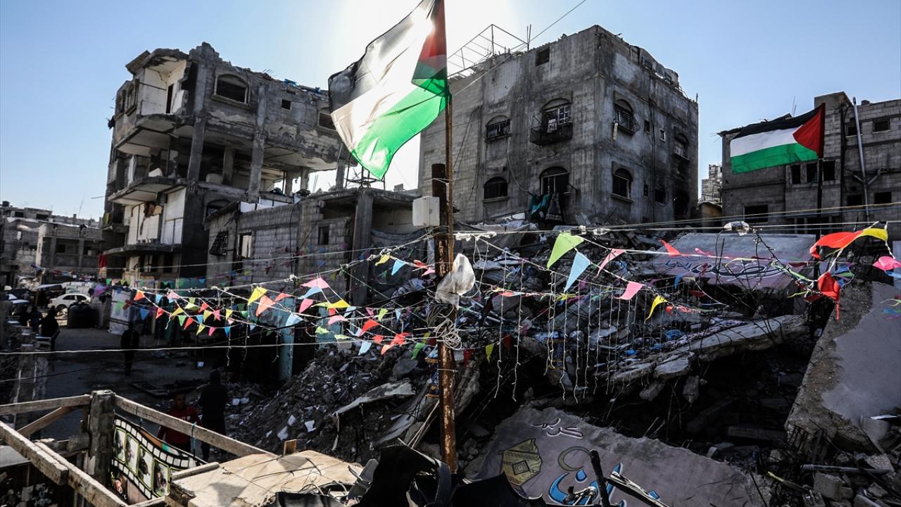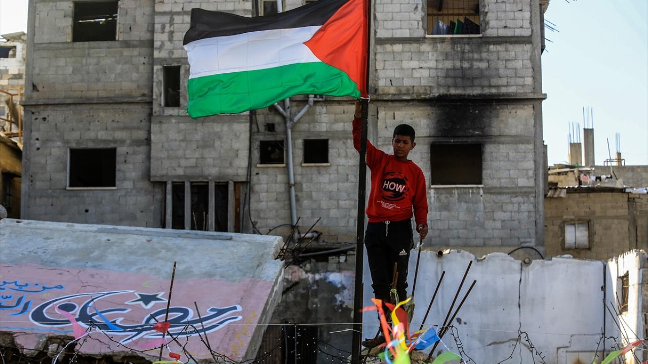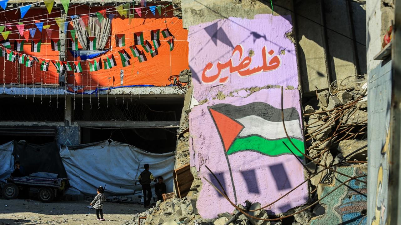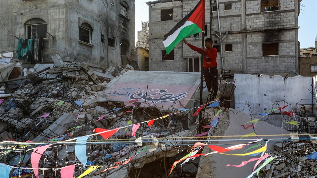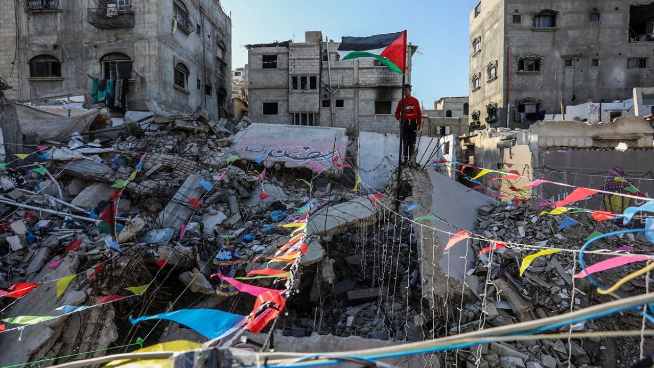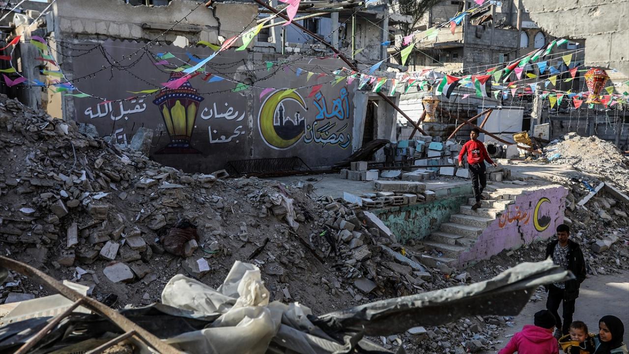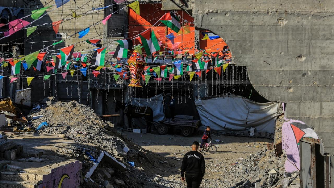 Gazze Şeridi’nin güneyindeki Han Yunus kentinde Filistinliler, İsrail ordusunun Gazze’ye yönelik son saldırılarında enkaza dönen binaların ve evlerin arasını süsleyerek Ramazan’ın manevi atmosferini yaşamaya çalışıyor.