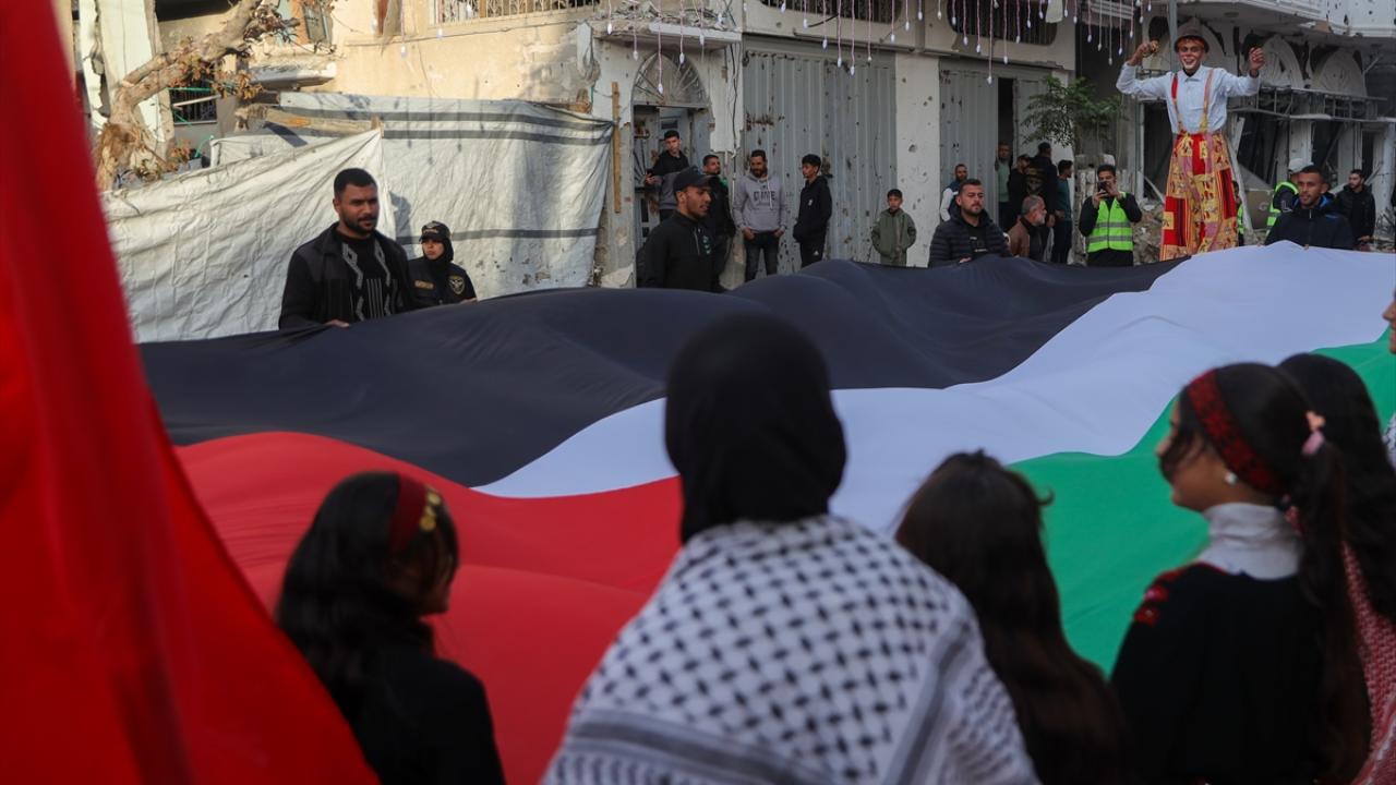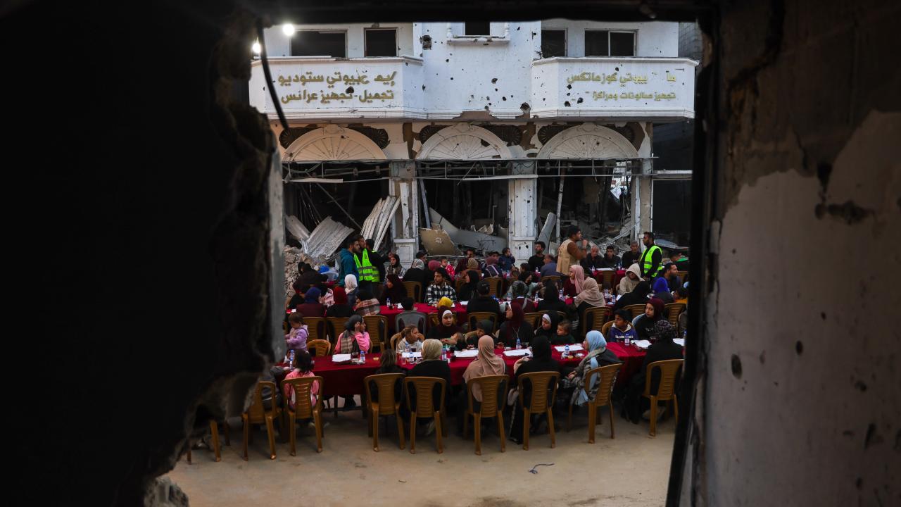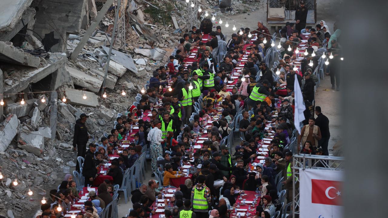 İsrail saldırılarında ağır yıkıma uğrayan Gazze Şeridi’nin güneyindeki Han Yunus kentinde yerinden edilen Filistinliler için toplu iftar programı düzenlendi.