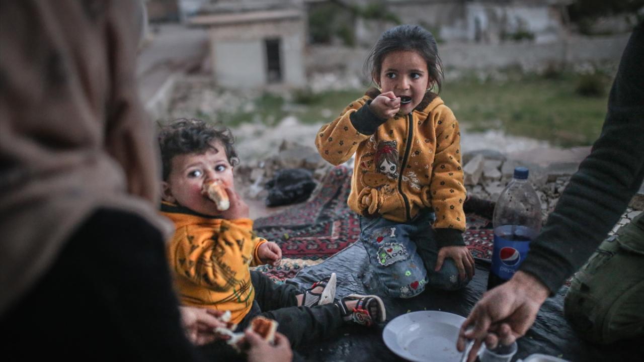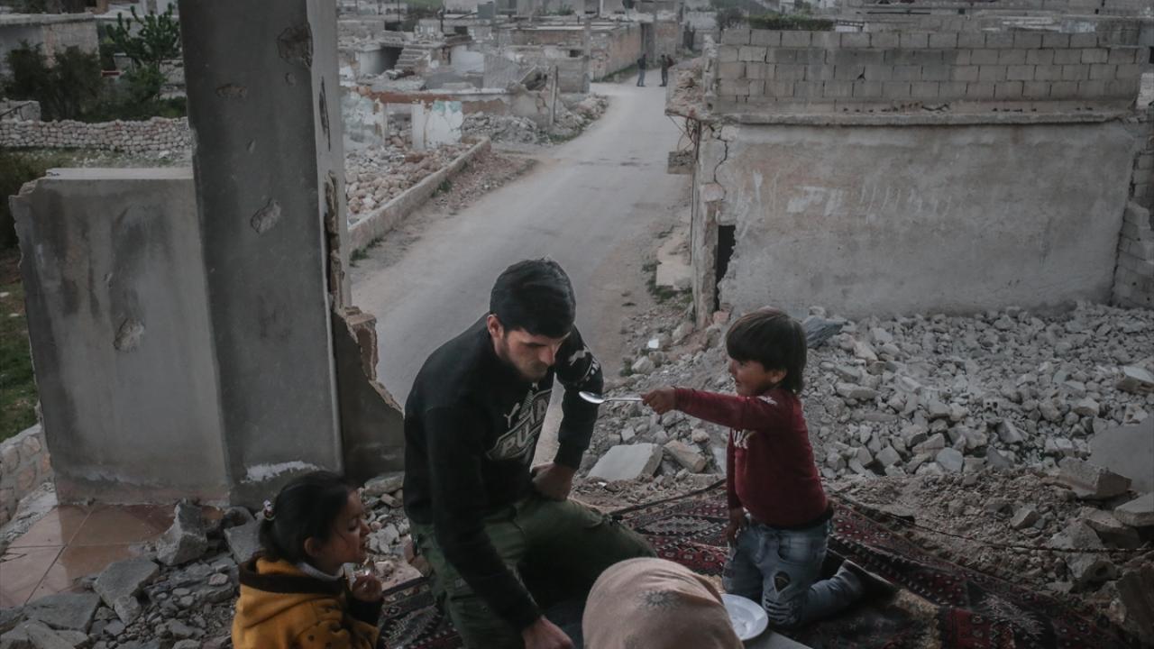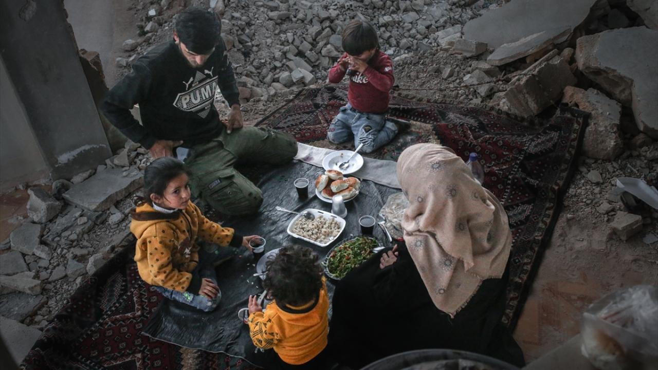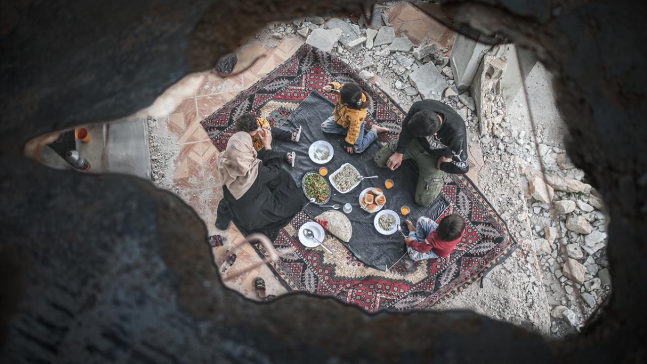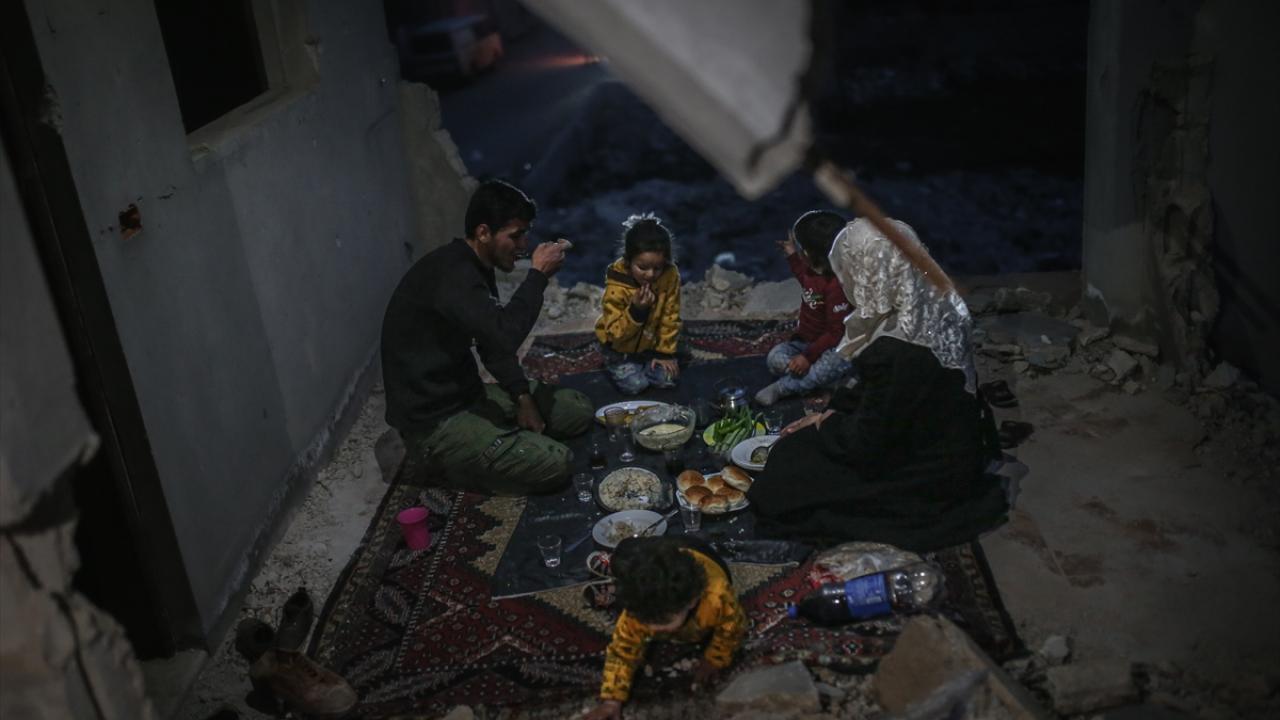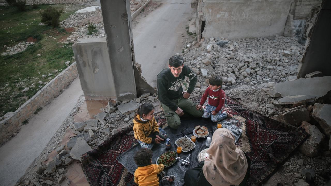 Suriyeli aile, İdlib’in Neyreb ilçesinde Beşşar Esed rejimi ve destekçilerinin yoğun saldırıları nedeniyle harabeye dönen evlerinde kurdukları iftar sofrasında oruçlarını açtı.