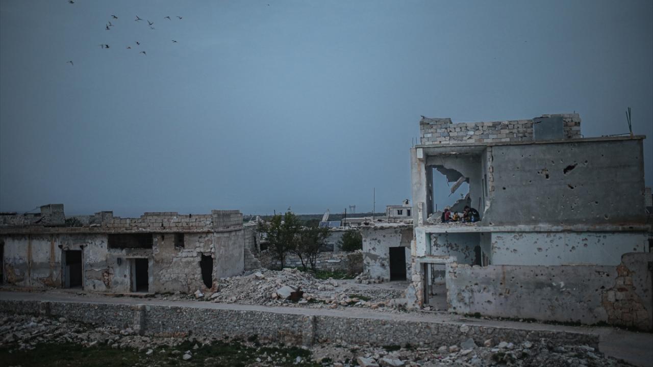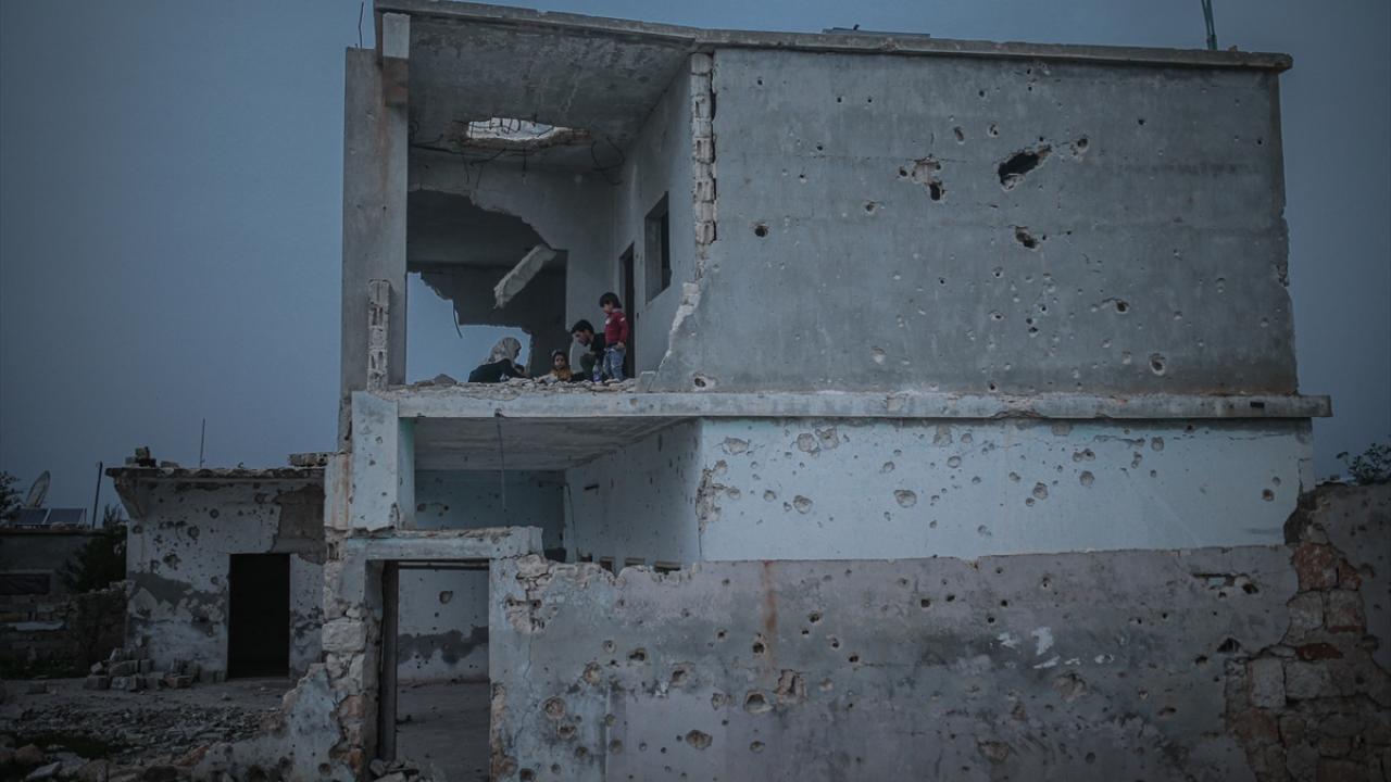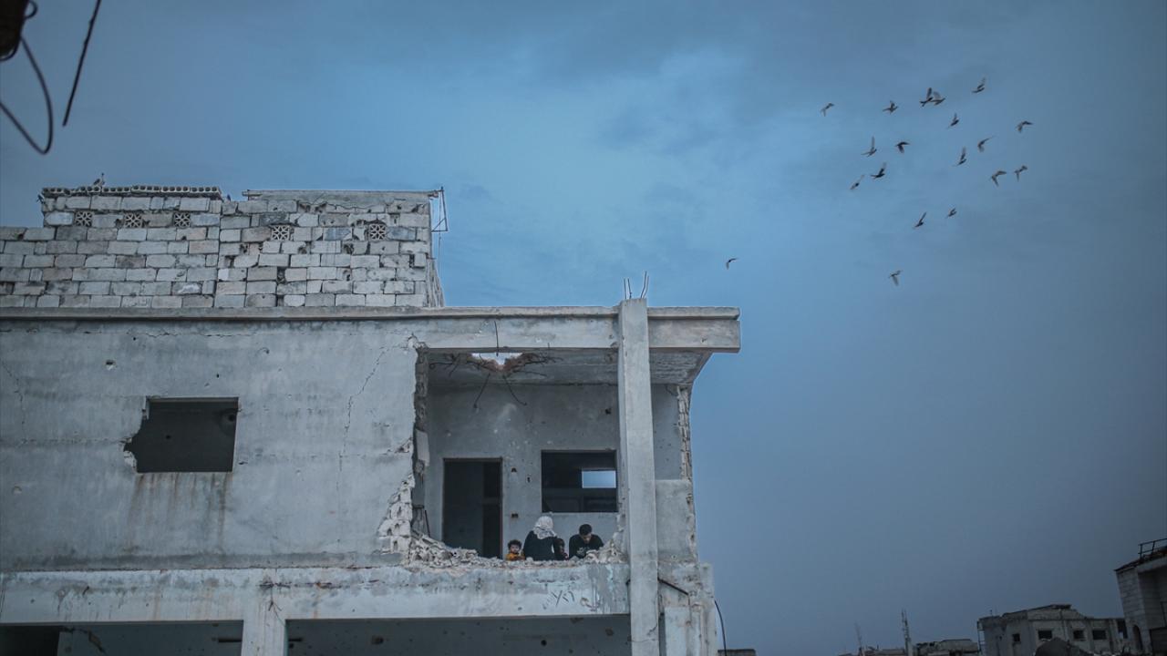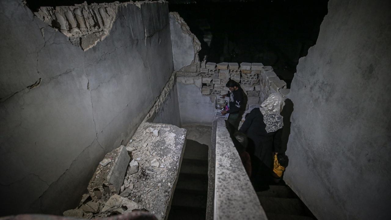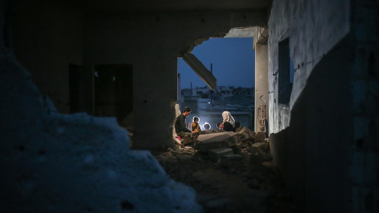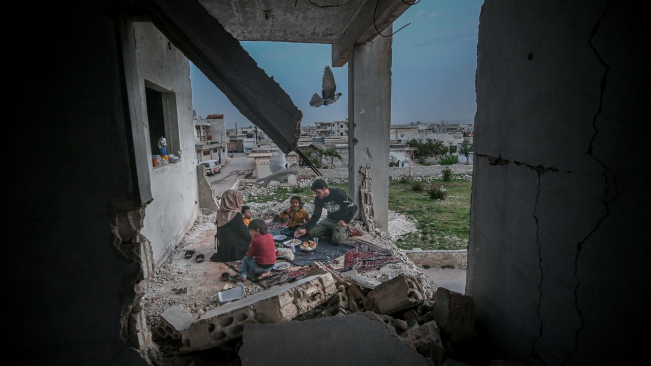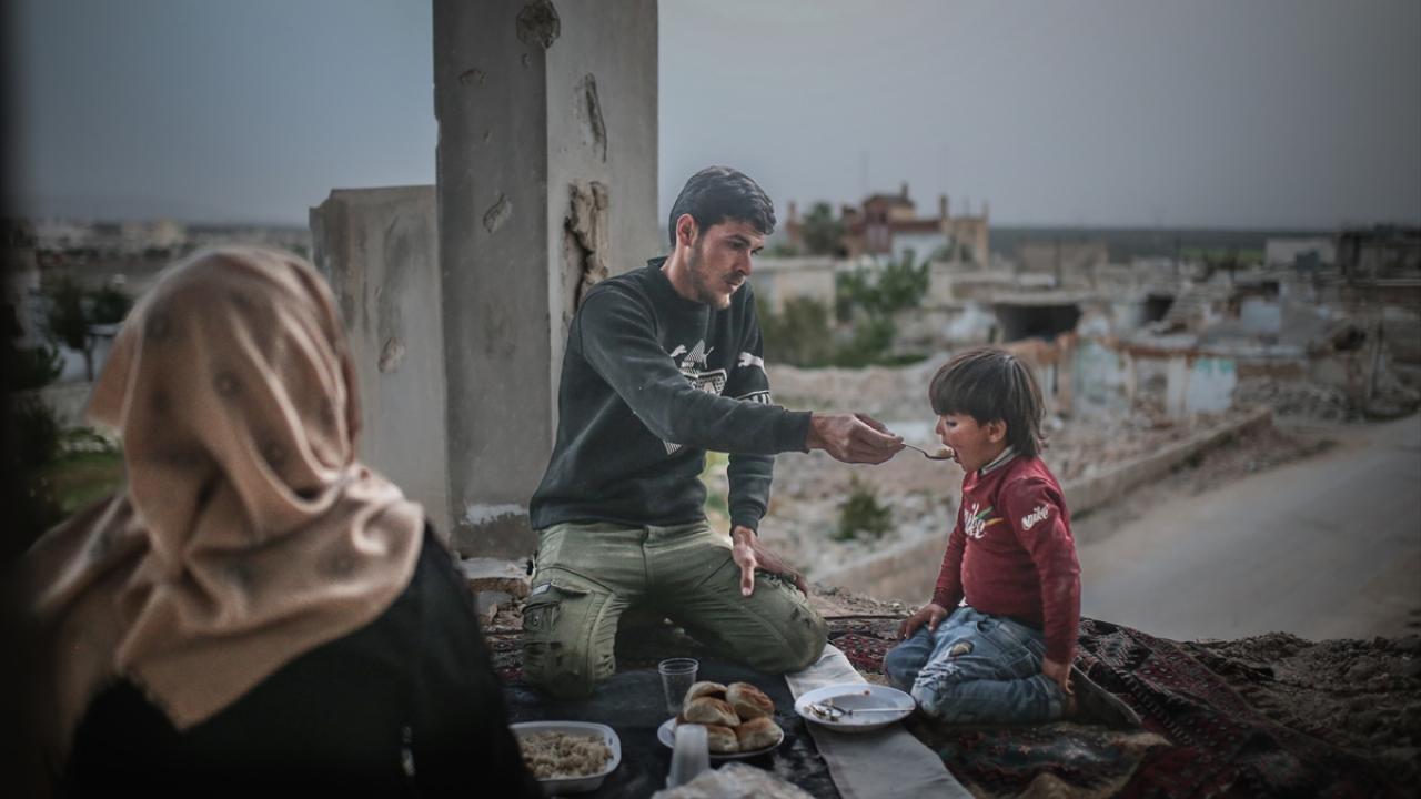 Suriyeli aile, İdlib’in Neyreb ilçesinde Beşşar Esed rejimi ve destekçilerinin yoğun saldırıları nedeniyle harabeye dönen evlerinde kurdukları iftar sofrasında oruçlarını açtı.