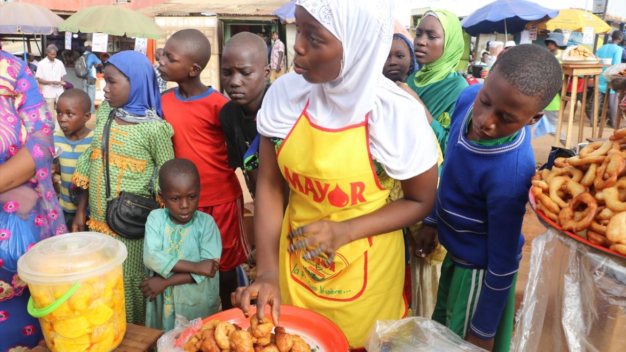 Geleneksel tatlı pazarlarında, çocuklar da annelerinin hazırladıkları Afrika kuskusu ve doğal içecekler gibi geleneksel lezzetleri satmak için yerini alıyor.