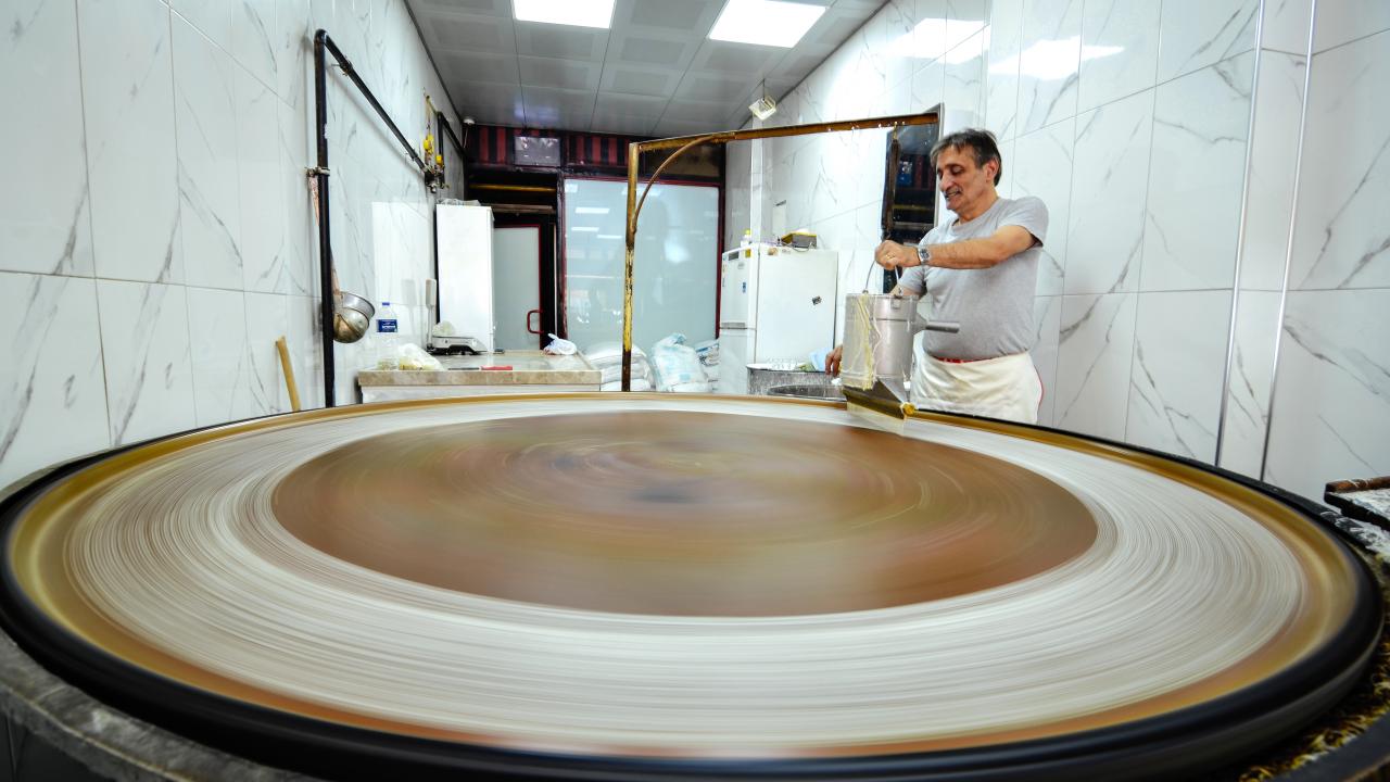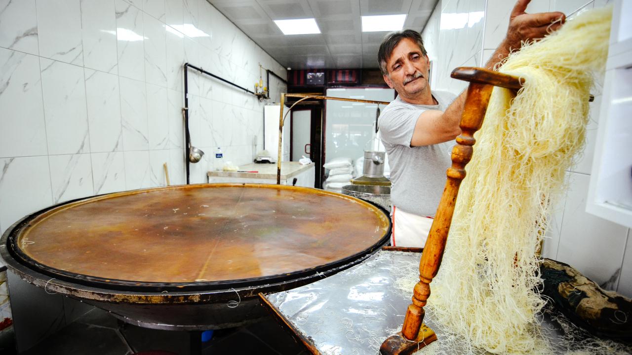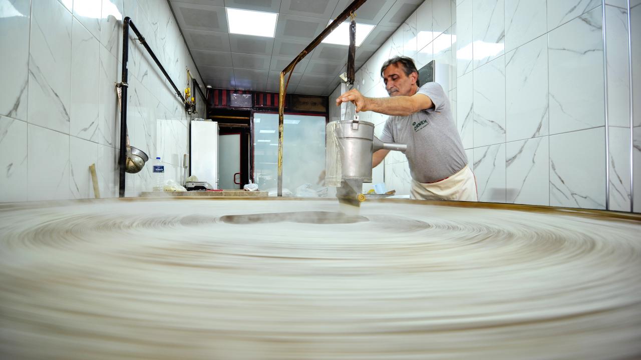 Babasından öğrendiği şekilde 40 yıldır kadayıf döken 57 yaşındaki Güvez, siparişler için erken saatlerde başladığı mesaisini geç saatlere kadar sürdürüyor.