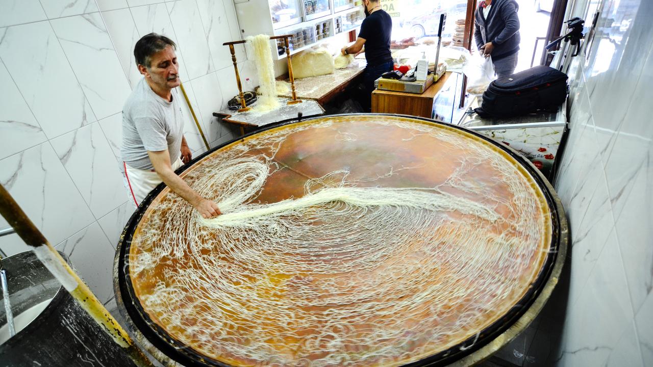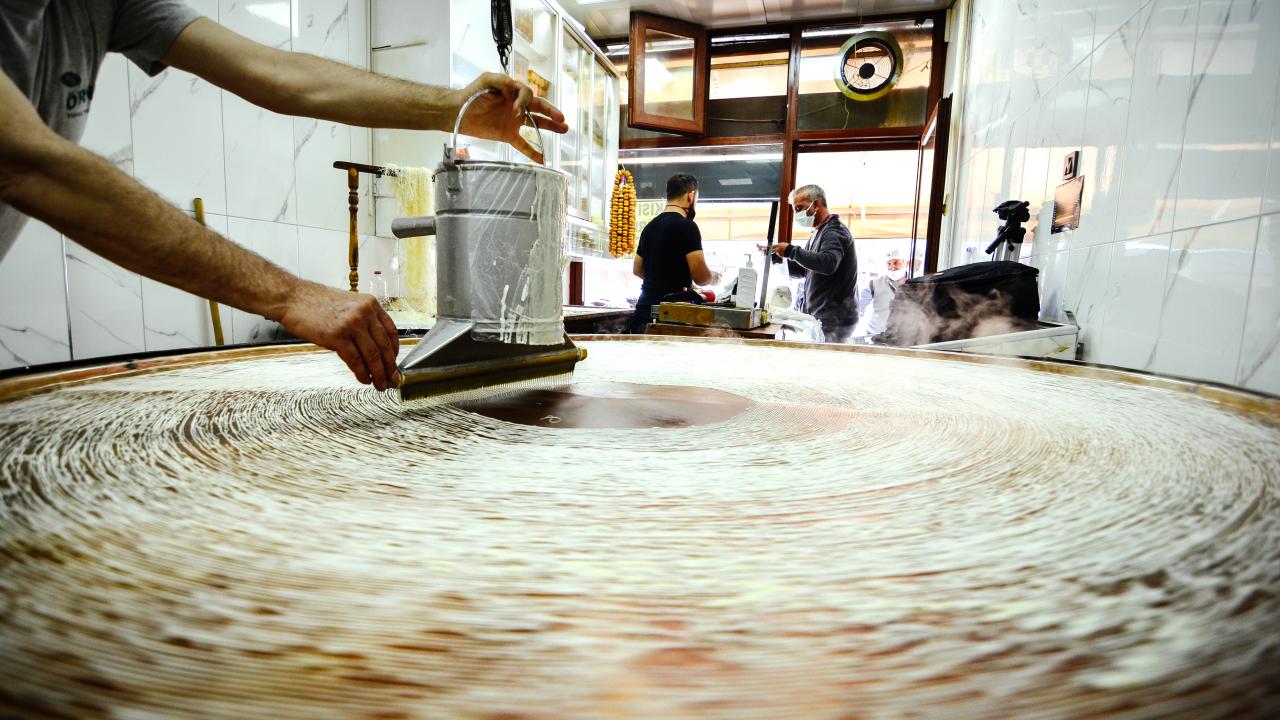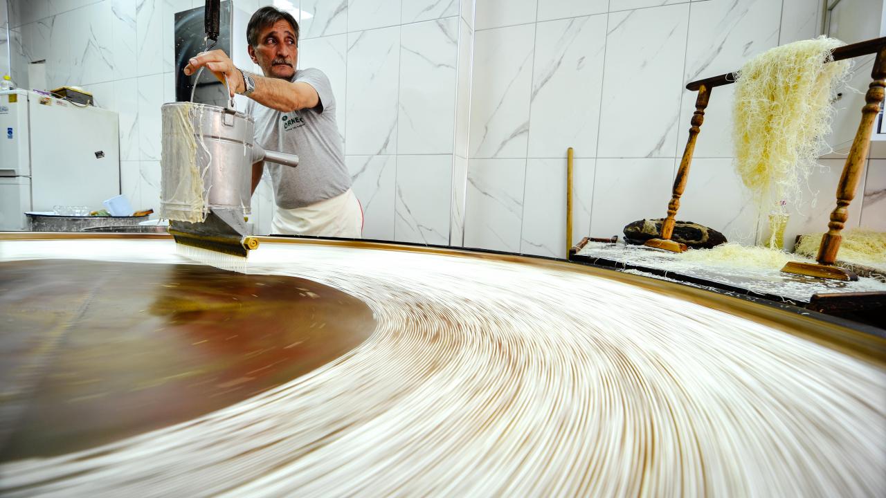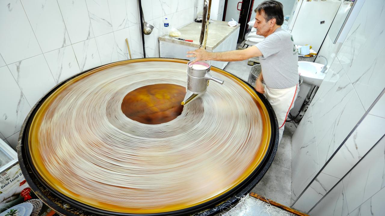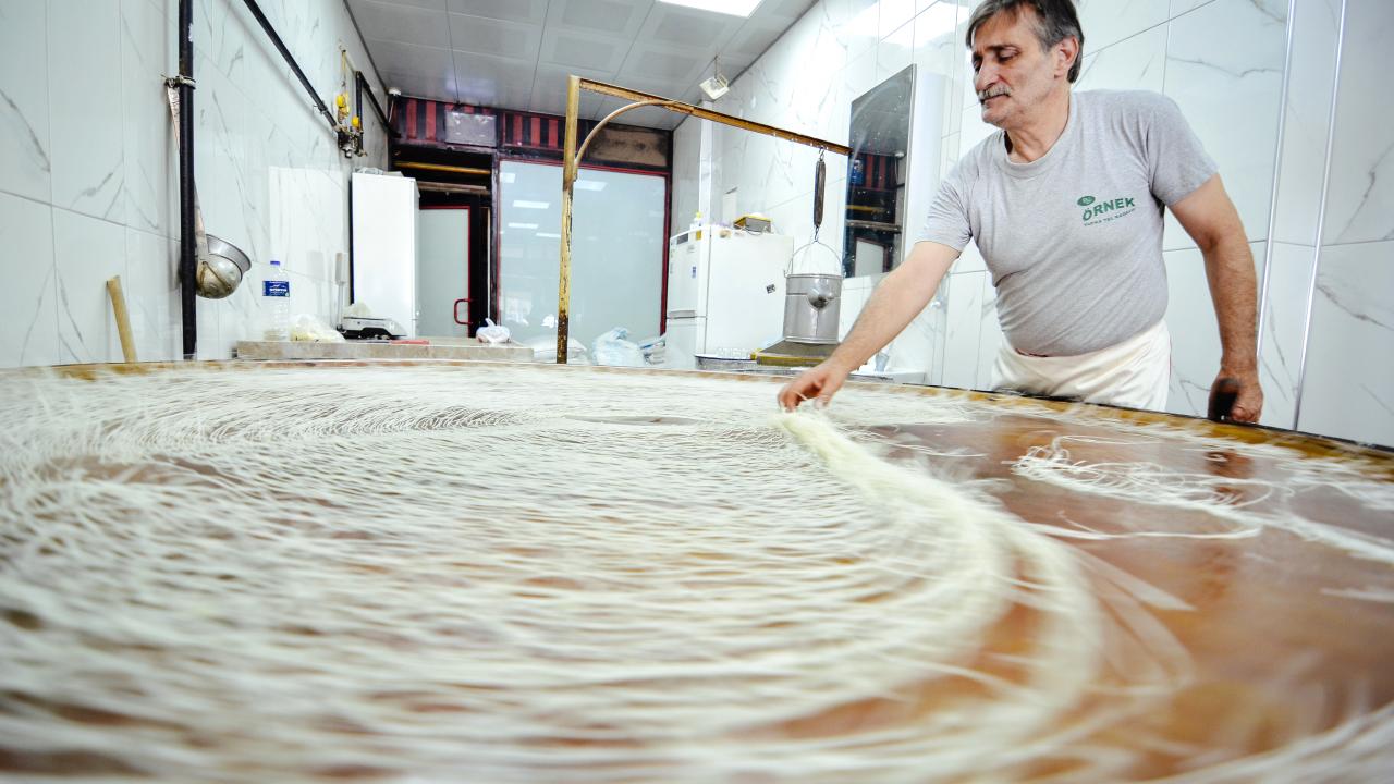 Un ve suyla hazırlanan karışımın, altında ateş yanan tepsiye dökülerek ince teller haline getirilmesiyle elde edilen kadayıf, uzun süren çalışmanın ardından damakları tatlandırıyor.