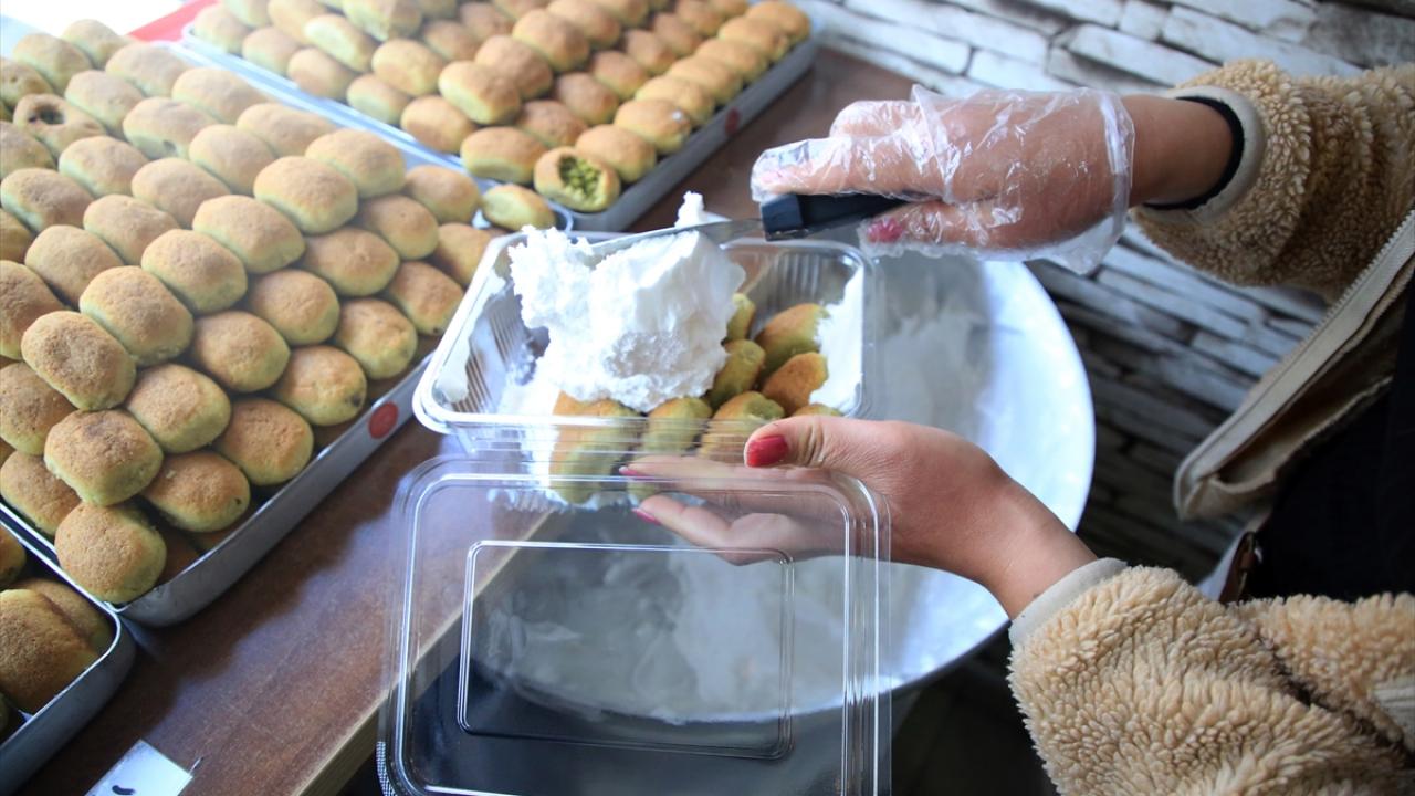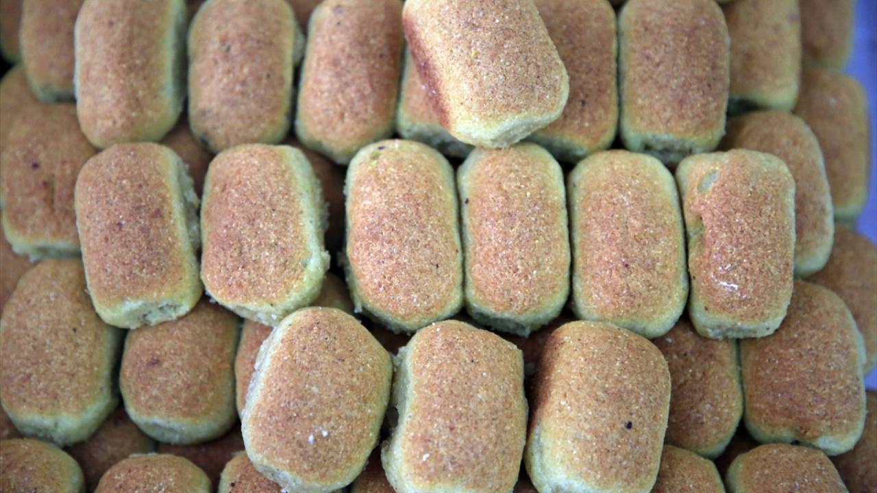 Hamurun irmik, yağ, karbonat ve şekerle yoğurulmasından sonra damak zevkine göre fıstıklı ya da cevizli olarak hazırlanan kerebiçler, üzerine çöven otu köklerinden yapılan kaymak konularak vatandaşların beğenisine sunuluyor.
