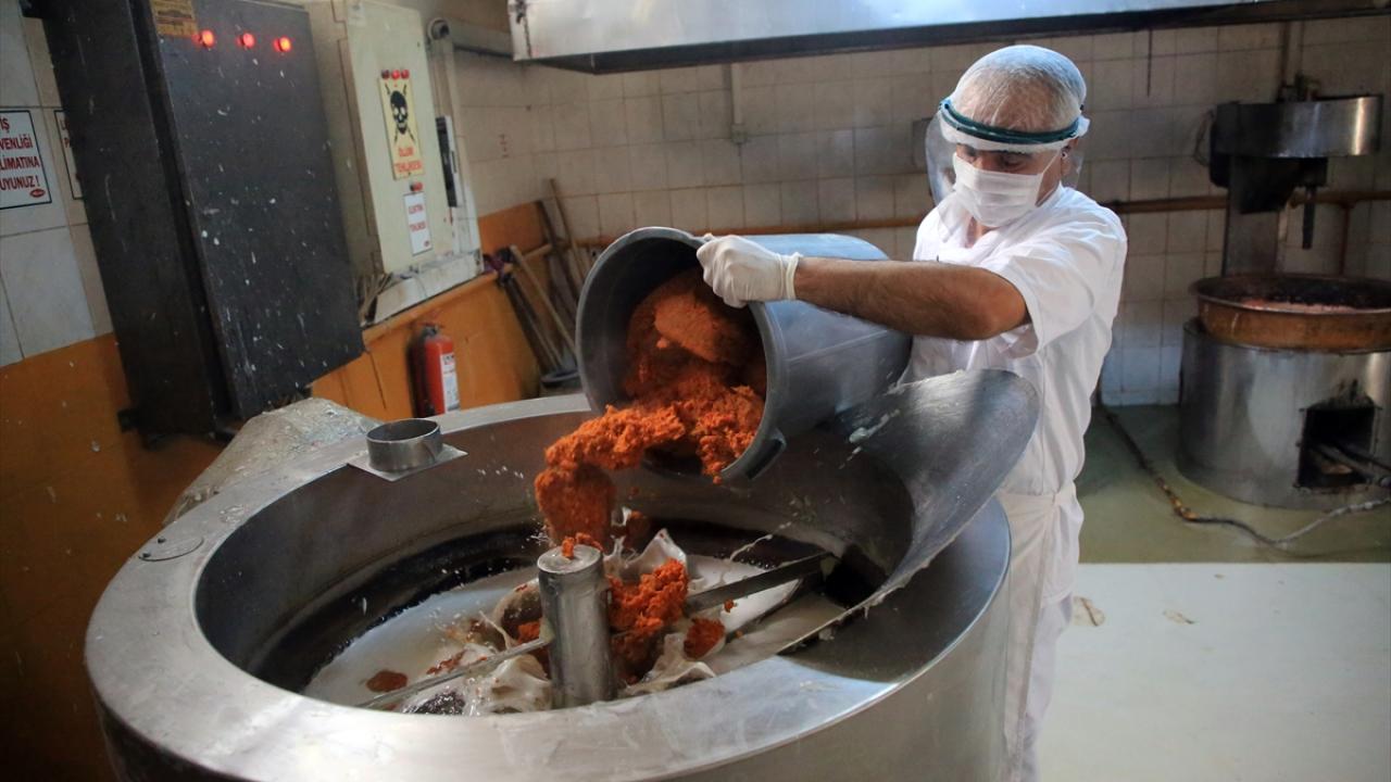Haşlanan havuçlar, kıyma makinelerinde geçirildikten sonra marmelat halini alması için 1 saat daha pişiriliyor.