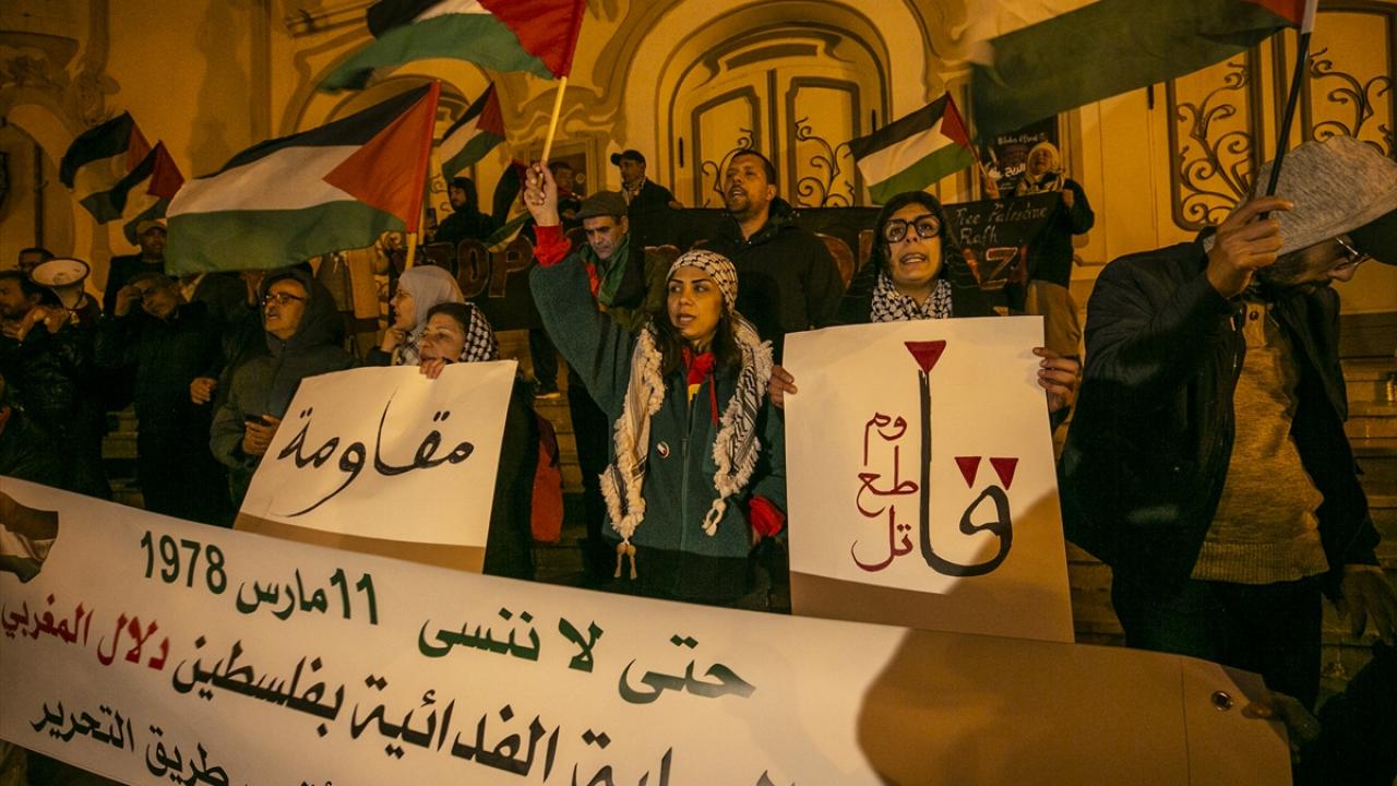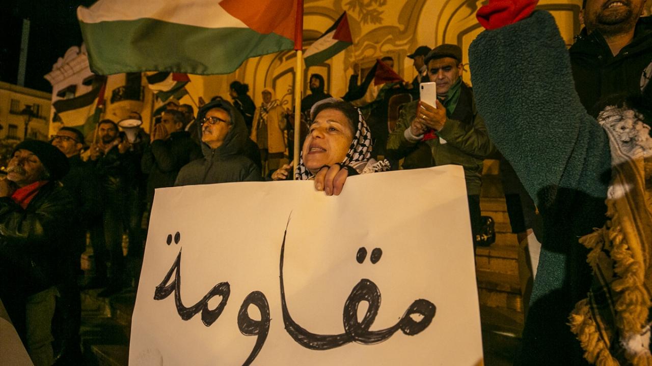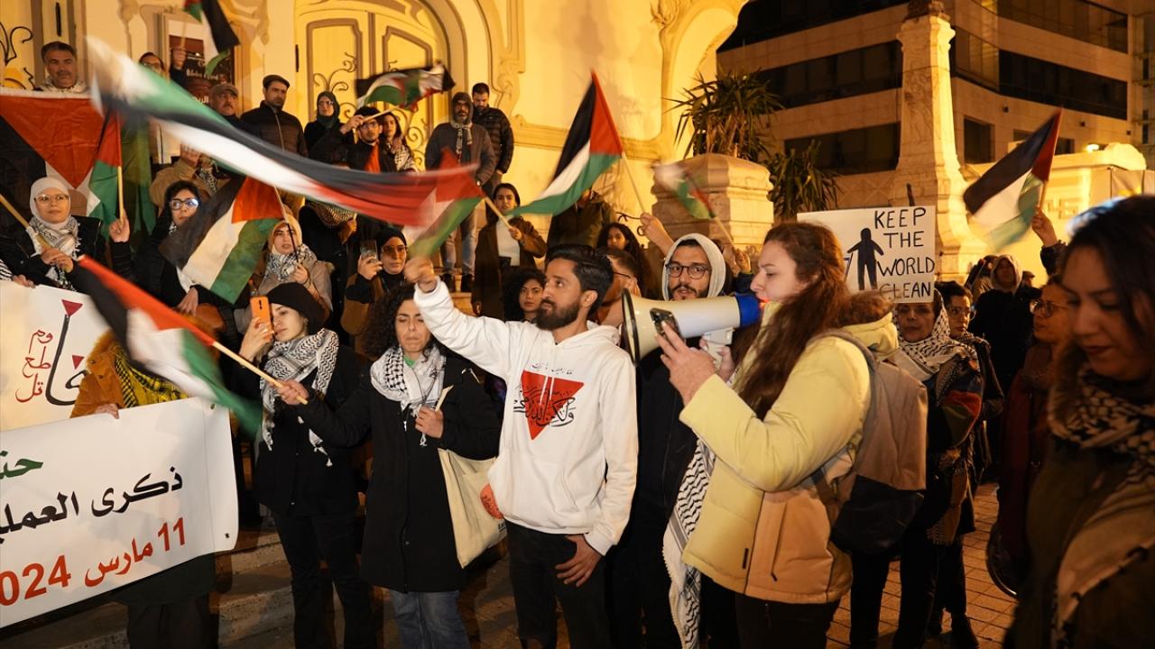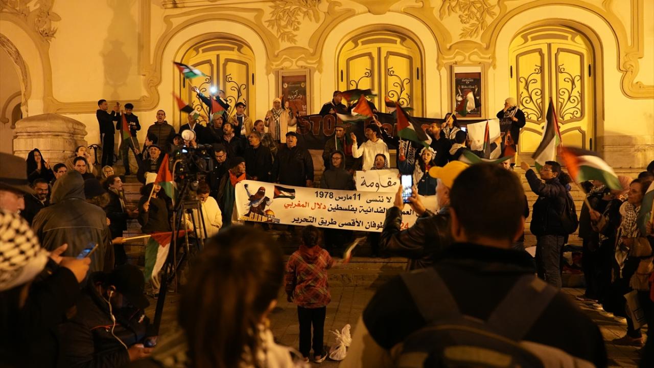 Tunus'un başkenti Tunus'taki Habib Burgiba Caddesi'nde toplanan bir grup, Ramazan ayının ilk gününde Filistin'e destek gösterisi düzenledi.