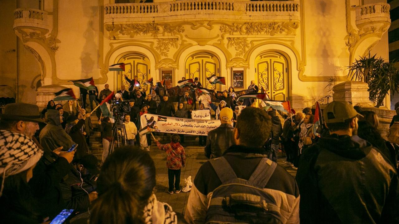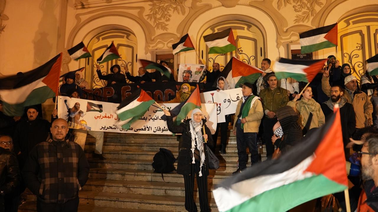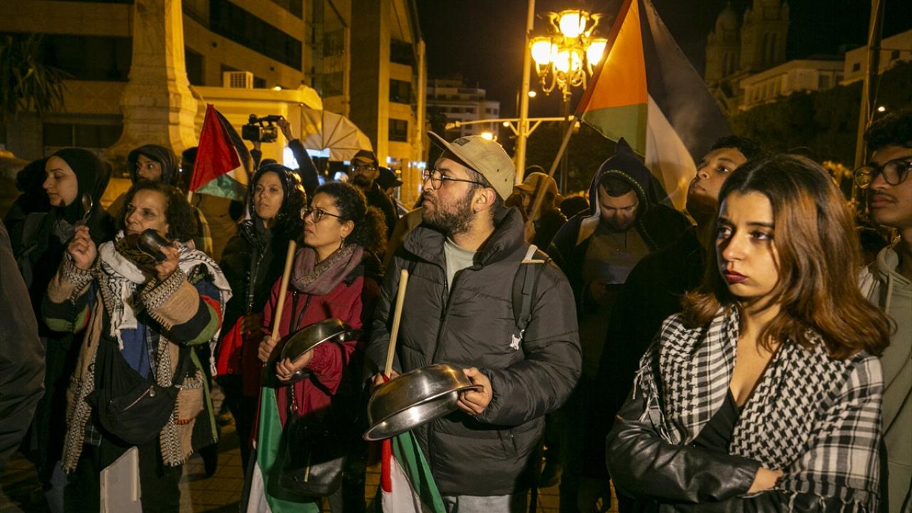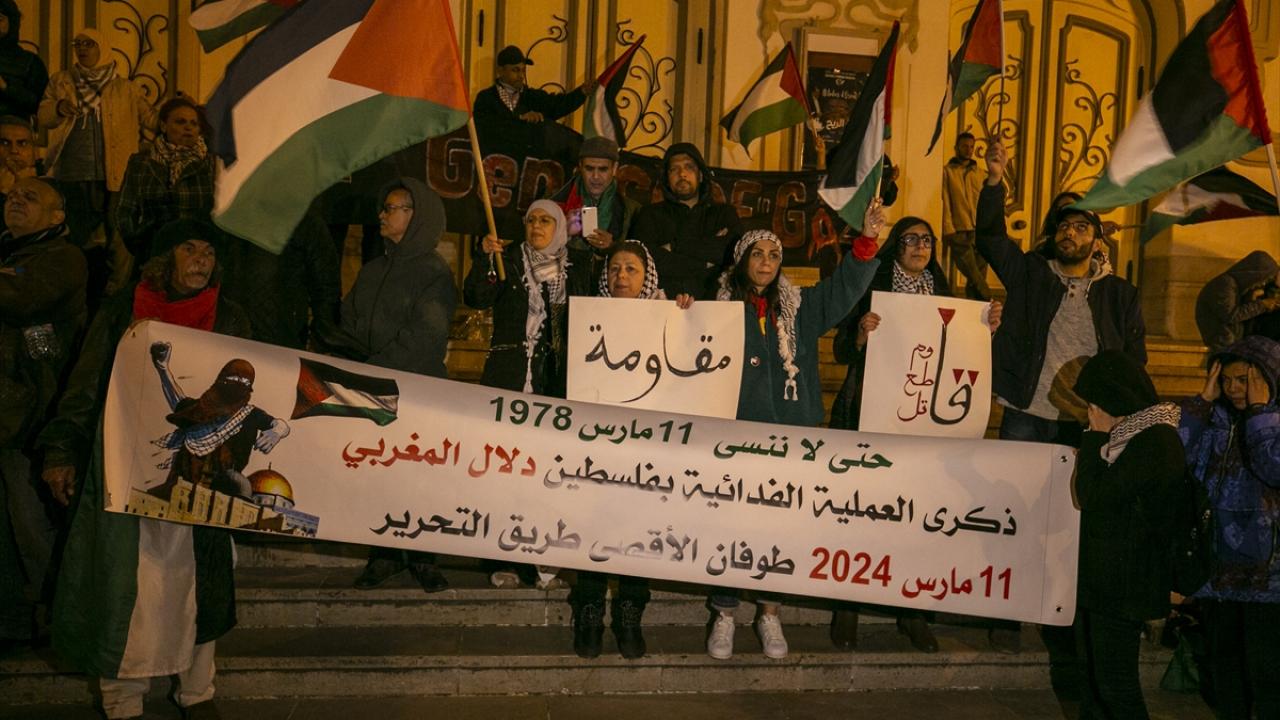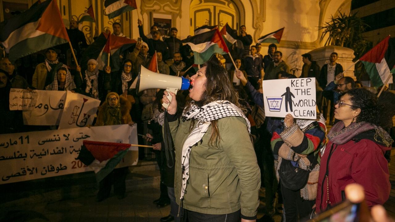 Tunus'un başkenti Tunus'taki Habib Burgiba Caddesi'nde toplanan bir grup, Ramazan ayının ilk gününde Filistin'e destek gösterisi düzenledi.