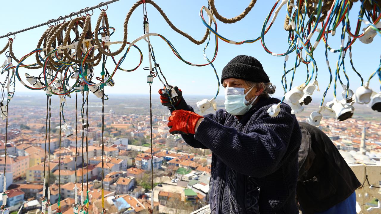 Yaklaşık 4 saat süren çalışmada önce mahya asılacak minareler arasına halatlar çekildi.