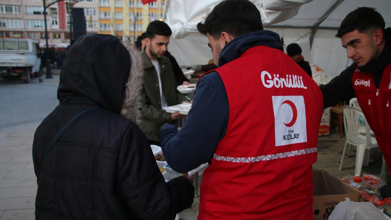 Kızılay gönüllüsü gençler ve vatandaşlar, Zafer Meydanı`nda kurulan iftar çadırında yemek dağıtıyor, dağıtımda sırada bekleyemeyen yaşlı ve engellilerin yemeklerini masalarına götürüyor.