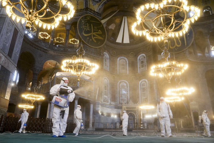 Caminin içine ve dışına da gül suyu sıkılırken, şadırvan, cami avlusu ve Ayasofya Meydanı sıcak suyla yıkandı.