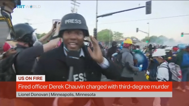 Protestoların ve polis şiddetinin had safhada olduğu bir diğer merkez olan Minneapolis’te de aynı dakikalarda bir başka TRT World muhabiri Lionel Donovan ve kameraman Barbaros Sayılgan da yaşananları ekrana taşırken yine polis şiddetinden kaçamadı. Lionel Donovan, kasığına isabet eden plastik mermiyle yaralandı.
