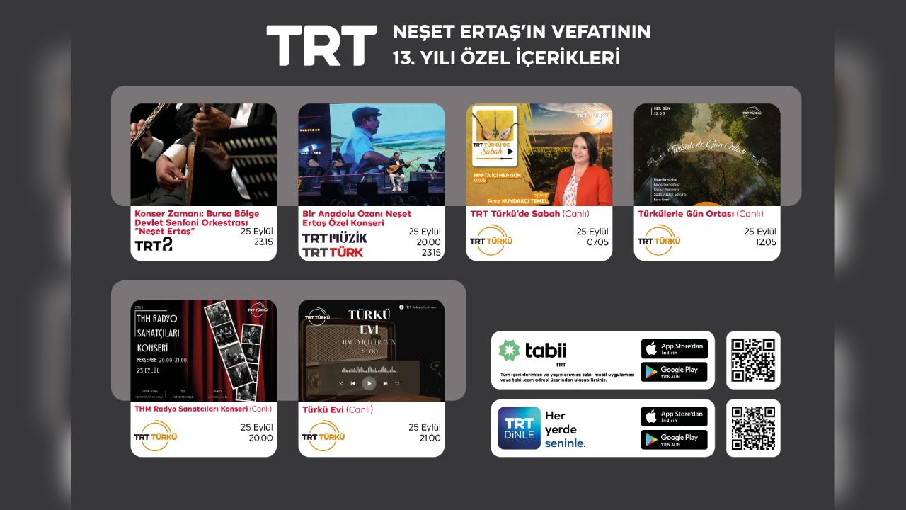 "Bir Anadolu Ozanı Neşet Ertaş Özel Konseri" programı ile Neşet Ertaş 25 Eylül Perşembe günü saat 20.00'de TRT Müzik ekranlarında en güzel ezgilerle anılacak. Aynı gün saat 23.15'te ise TRT Türk ekranlarından izleyicilerle buluşacak.