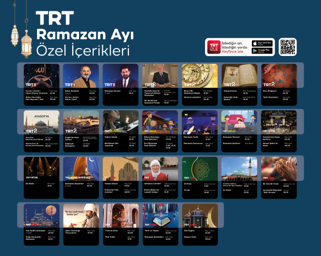 TRT 1 ekranları, bu yıl da özel içerikleriyle izleyiciyi karşılayacak. Ramazan ayının vazgeçilmezi “Kur’an-ı Kerim’i Güzel Okuma Yarışması” 22 Mart Çarşamba günü saat 23.30’dan, 23 Mart Perşembe gününden itibaren iftar programı “Ramazan Sevinci” saat 18.15’te ve gecenin huzuruyla “Sahur Bereketi” saat 04.00’te Ramazan ayı boyunca her gün TRT 1 ekranlarında yer alacak.