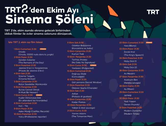 Türkiye’nin kültür sanat kanalı TRT 2’nin merakla beklenen ekim ayı filmleri belli oldu. Birçok alanda özel yapımları izleyiciyle buluşturan TRT 2, ekim ayında her akşam farklı bir filmi sinemaseverlerin beğenisine sunacak.