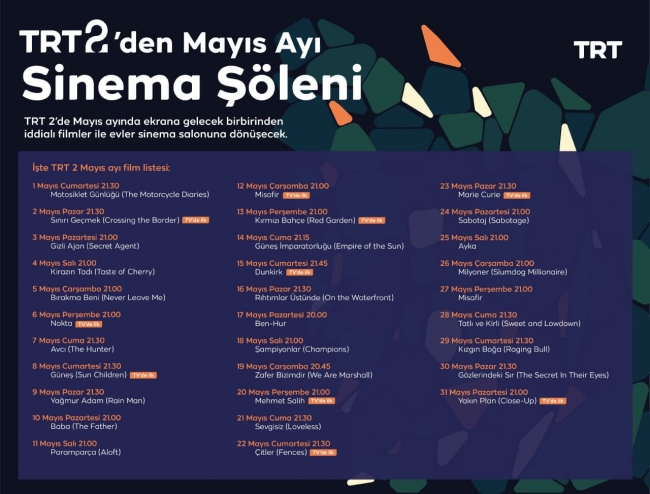 Türkiye’nin kültür sanat kanalı TRT 2’nin merakla beklenen mayıs ayı filmleri belli oldu. Birçok alanda özel yapımları izleyiciyle buluşturan TRT 2, mayıs ayında her akşam farklı bir filmi sinemaseverlerin beğenisine sunacak.