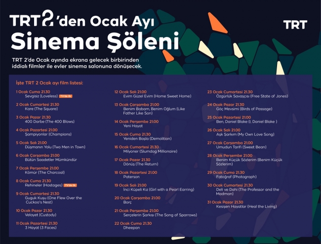 Türkiye’nin kültür sanat kanalı TRT 2’nin merakla beklenen ocak ayı filmleri belli oldu. Birçok alanda özel yapımları izleyiciyle buluşturan TRT 2, ocak ayında her akşam farklı bir filmi sinemaseverlerin beğenisine sunacak.
