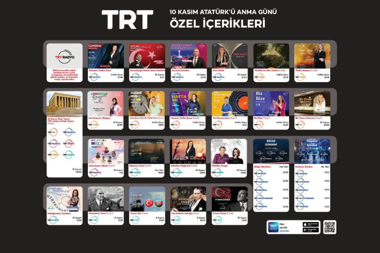 TSR gün boyunca Gazi Mustafa Kemal Atatürk’ü ölümünün 85. yıl dönümünde farklı yönleri ile ele almak ve anlatmak için hazırladığı birbirinden özel içerikleri, dünyanın dört bir yanındaki vatandaşlarımız ve soydaşlarımız ile buluşturacak. TRT Radyo 1, TRT FM, TRT Radyo 3 ve TRT Bölge Radyoları da gün boyunca özel içerik, program ve söyleşileri dinleyiciyle buluşturacak.