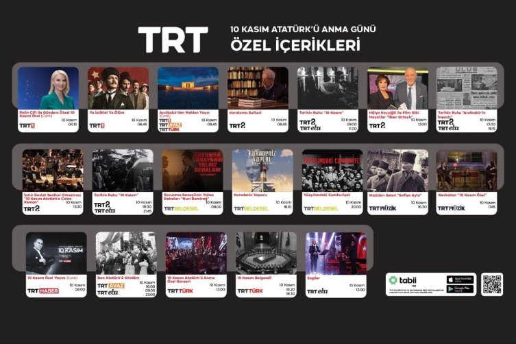 Türkiye Cumhuriyeti’nin kurucusu Gazi Mustafa Kemal Atatürk’ün vefatının 86’ncı yıl dönümüne özel yayınlar, 10 Kasım Atatürk’ü Anma Günü’nde TRT ekran ve radyolarından izleyici ve dinleyicilere sunulacak.