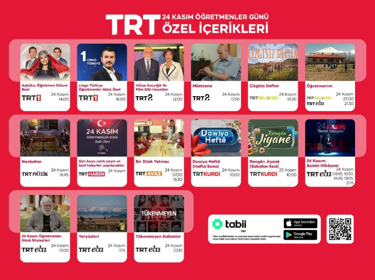 24 Kasım Öğretmenler Günü için hazırlanan özel içerikler, TRT’nin televizyon ve radyo kanallarında izleyici ve dinleyiciyle buluşacak.