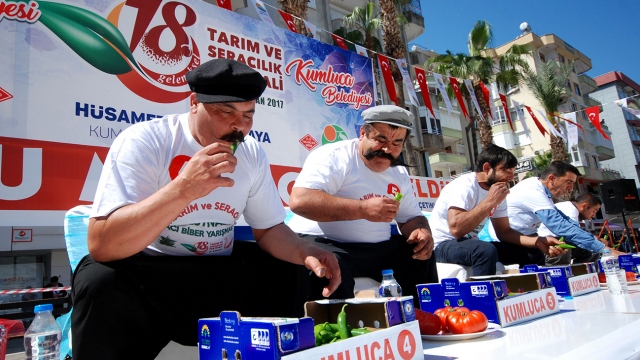 Antalya'nın Kumluca ilçesinde Tarım ve Seracılık Festivali kapsamında acı biber yeme yarışması yapıldı. Yarışmacılar, 3 dakika içinde en fazla biberi yemek için kıyasıya mücadele etti.