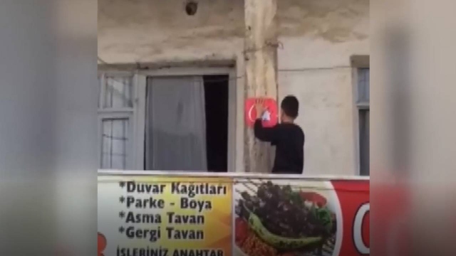 Mardin Nusaybin'de 23 Nisan günü evinin balkonuna kendi çizdiği bayrağı asmaya çalışan Abdullah'a polisler Türk Bayrağı hediye etti.