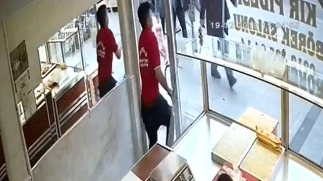 İstanbul'da börekçide çalışan bir genç, dışarıya çıkmak için açık sandığı kapıya sert bir şekilde çarptı. Camın tuzla buz olduğu anlar kameraya yansıdı.