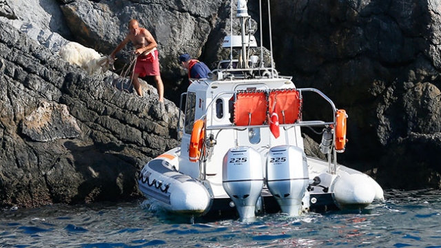 İzmir'in Çeşme ilçesi açıklarındaki Eşek Adası'nda kayalıklarda mahsur kalan keçiyi Sahil Güvenlik ekibi kurtardı.