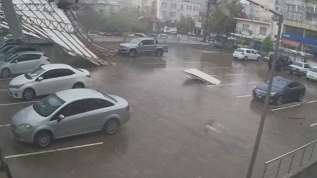 Adıyaman Kahta’da etkili olan şiddetli fırtına çatıları uçurdu. Yedi aracın zarar gördüğü olay saniye saniye güvenlik kameralarına yansıdı.
