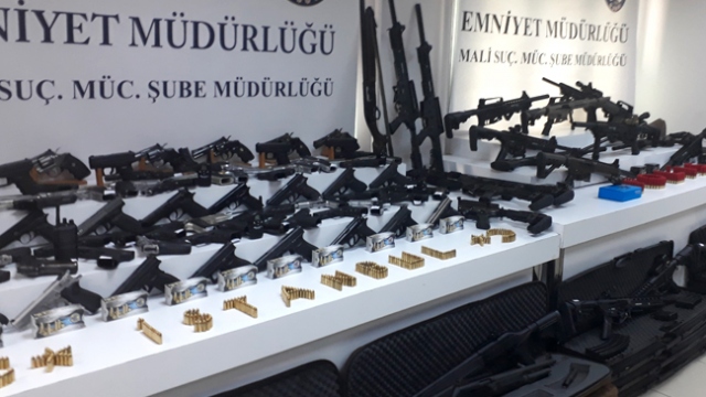 Adnan Oktar grubuna yönelik soruşturma kapsamında, ele geçirilen 96 tabanca, 23 tüfek ve çok sayıda mermi basın mensuplarına sergilendi.