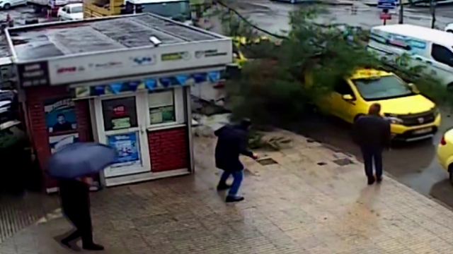 Zonguldak'ta, belediye ekiplerince yapılan çevre düzenlemesi sırasında kaldırım kenarındaki ağaç, durakta park halindeki taksinin üzerine düştü. Şans eseri olayda yaralanan olmadı. O anlar bir iş yerinin güvenlik kamerası görüntülerine yansıdı.