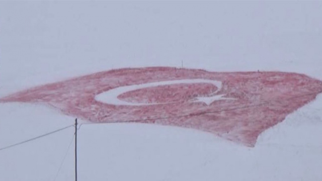Ağrı'da öğrenci ve akademisyenler kar üzerine devasa Türk bayrağı yaptı. Yapımı 8 saat süren bayrak için 18 kişilik bir ekip çalıştı.