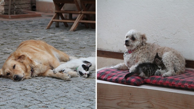 Amasya'da bir otelin bahçesinde yaşayan köpekler, kısır olmalarına rağmen annesiz kedileri emziriyor.