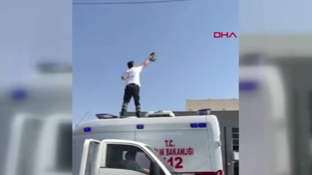 Ambulansın üzerine çıkıp tellere takılan güvercini kurtardı
