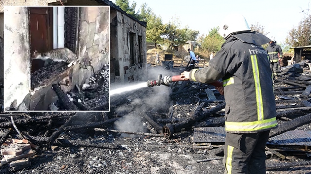 Anne kedi, yavruları için yanan binanın önünden ayrılmadı