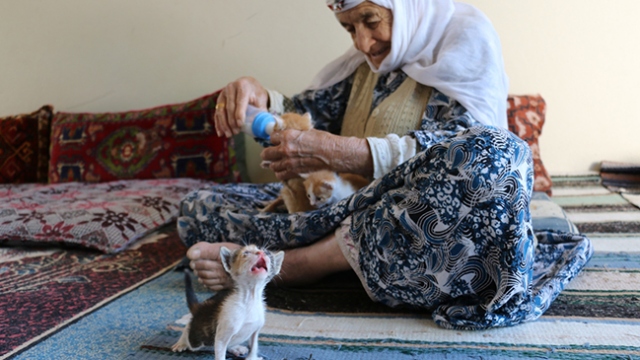 Adıyaman Kahta’da yaşayan 96 yaşındaki Zeynep Duran, anneleri ölen dört kedi yavrusunu biberonla besliyor.