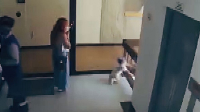 Kolombiya’da ofis binasında telefona bakan kadın, yanından uzaklaşıp, gittiği merdiven boşluğunda, düşme tehlikesi geçiren bebeğini, son anda yakaladı.