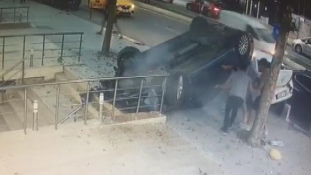 İstanbul’da, direksiyon hakimiyetini kaybeden sürücü, park halindeki araca çarptıktan sonra takla atarak kaldırıma düştü. O sırada kaldırımda yürüyen 2 kişi ölümden döndü.