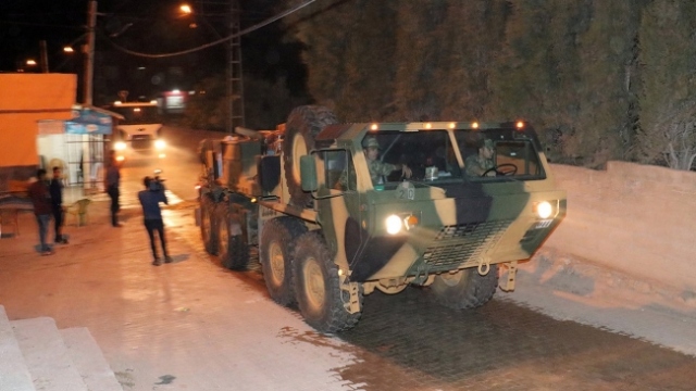 İdlib'deki çatışmasızlık bölgesine yönelik intikal kapsamında Hatay'a gelen çok sayıda askeri araç, ambulans ve konteyner, Reyhanlı ilçesinde sınır hattına konuşlandırıldı.