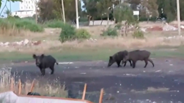 Balıkesir'in Ayvalık ilçesinde aç kaldığı tahmin edilen yaban domuzları şehir merkezine indi.