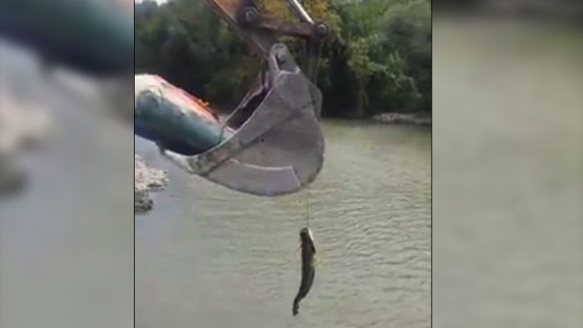 Sakarya Nehrinde oltayla yaklaşık 25 kiloluk yayın balığı avlayan vatandaş, oltayla çıkaramadığı balığı kiraladığı kepçe ile sudan çıkartabildi.