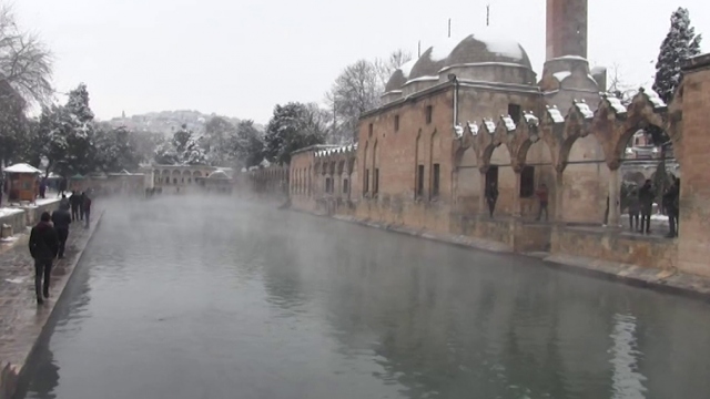 Şanlıurfa'da etkili olan kar nedeniyle, tarihi Balıkgöl beyaza büründü.