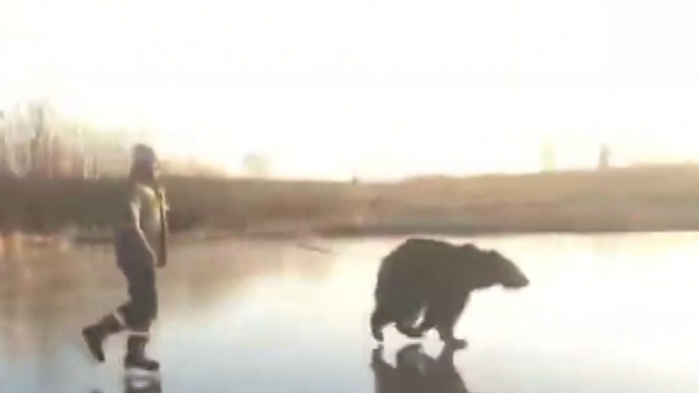 Barınaktan aldığı ayıyla donmuş nehirde buz pateni yaptı