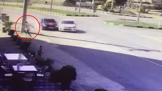 Bartın'da, iki otomobilin çarpıştığı kazada, yol kenarında bekleyen bir kişi otomobilin altında kalmaktan son anda kurtuldu. O anlar bir iş yerinin güvenlik kamerasına yansıdı.