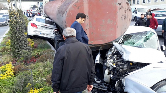 İstanbul Başakşehir'de arıza yapan tankerini tamir etmek isteyen sürücü, yol kenarına park ettiği aracın altına girdi. Bu sırada kayan tanker, seyir halindeki 12 araca çarptı.